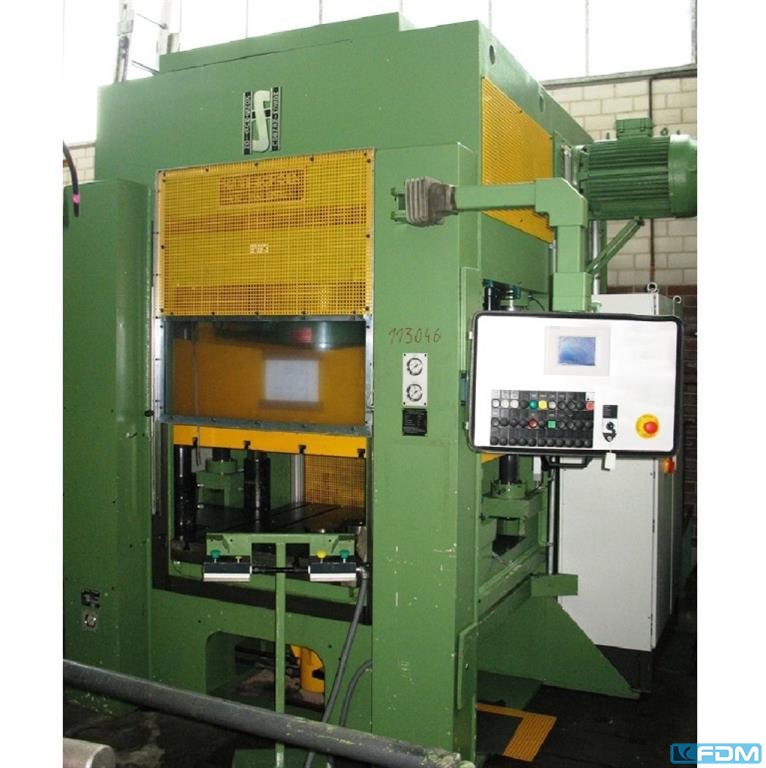 pressure:100 t distance between columns:1060 mm stroke:700 mm distance table/ram, max. stroke up, adjustment up:1250 mm table surface area:1000 x 700 mm pressure of drawing cushion in table:40 t stroke of drawing cushion in table:200 mm die cushion area:Ø 250 mm table height over floor:950 mm side window:580 x 750 mm ram surface:1000 x 700 mm oil volume:700 l power requirement:47,0 kW weight:13,0 t Dimensions (WxDxH):2,2 x 1,8 x 5,0 m German Safety: permitted for manual loading:UVV 11.064 - VBG 7n5.2 depth stop:mechanical; motoric adjustable ram interlocking:SITEMA