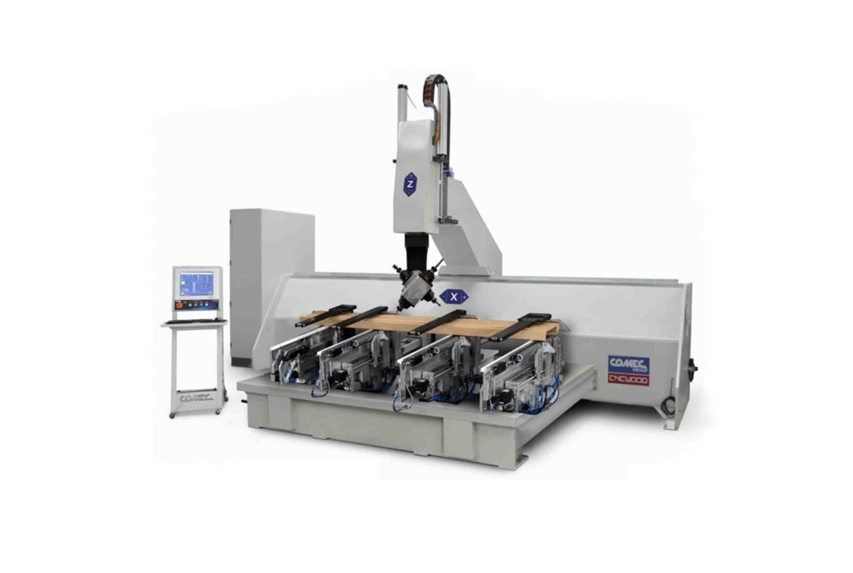 CNC working center Brand: Comec Type: Variax J new machine The highest level of progress for your door frame production: 6 controlled axes and a fast production process characterize the Variax J. Movable machining support - All axes move on ball bearing mounted BOSCH-REXROTH or comparable linear guides - Movement / positioning of the machining units max. 70 m/min. - Axis X = 2950 mm - Axis Y = 400 mm - Axis Z = 500 mm - Axis support for vertical rotation of the machining head. axis B from -135° to +135°, motor kW 0.45. - Axis support for horizontal rotation of the machining head. Axis C from -180° to +180°, motor kW 0.45. Machining head - electrospindle 1-2 - N°1+1 electrospindle fixed to the H support - N°1 electrospindle for milling, - with 2 spindle outputs, kW 7.0 / 12-18.000 rpm, adjustable by means of frequency converter Tool attachment wit ...