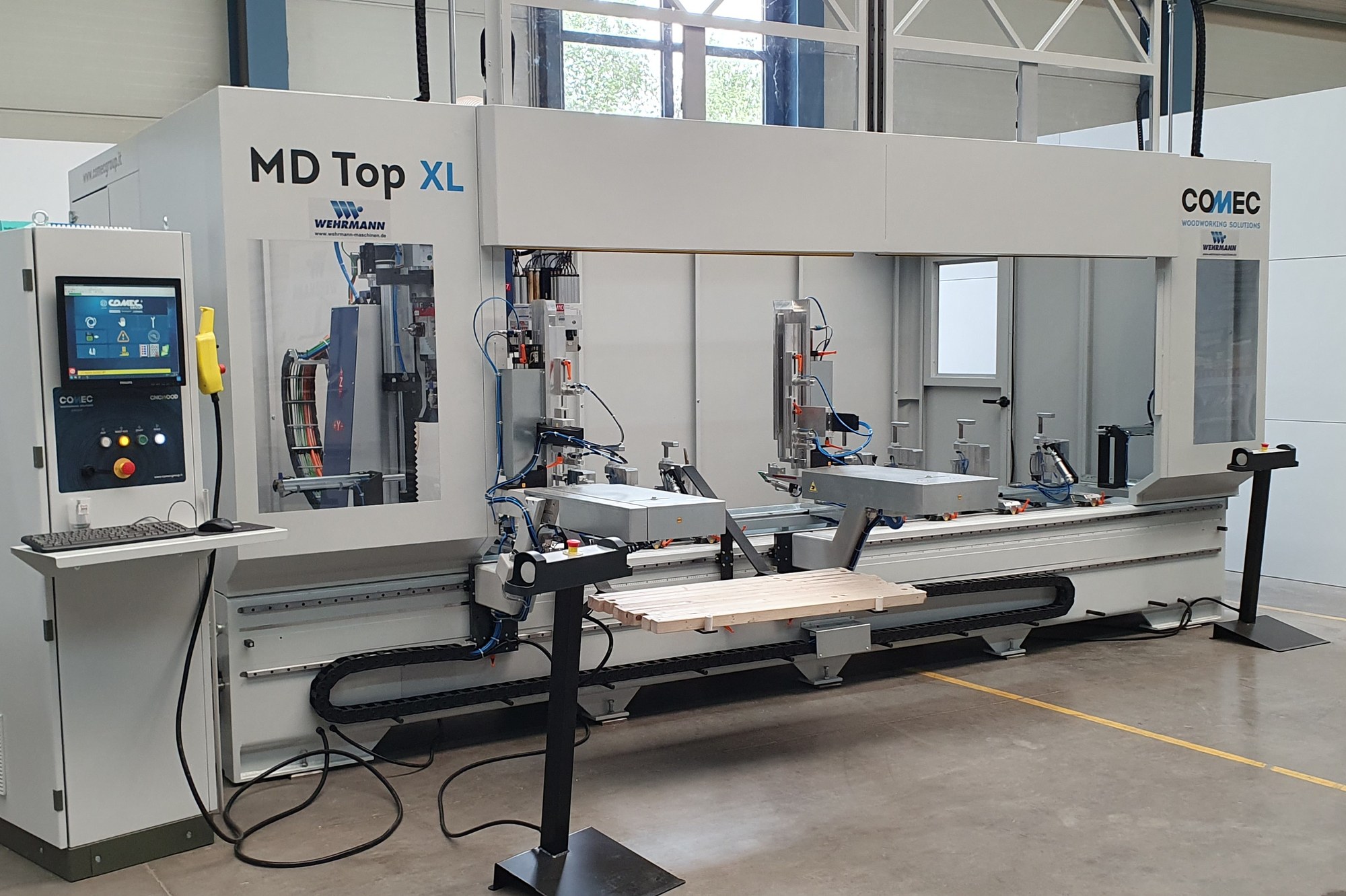 CNC - Bearbeitungszentrum Fabrikat: COMEC Typ: MD TOP XL Die ideale Lösung für CNC - Bearbeitungen an schmalen, komplizierten Werkstücken COMEC macht´s Ihnen einfach Kopfkonfigurationen individuell konfigurierbar für: - Sägen mit 360 Grad - Achse - Fräsaggregate für horizontale und vertikale Bearbeitungen - Bohrköpfe mit einzeln abrufbaren Spindeln vertikal und horizontal - Mehrspindelreihenbohrköpfe einzeln abrufbar auch horizontal - Horizontalfräsaggregat mit 360 Grad C - Achse Speziell entwickelter Spanntisch, verfährt in X - Richtung automatisch programmgesteuert Individuelle Ausstattung möglich, zum Beispiel: Grundrahmen Schwerer Grundmaschinenständer, Elektroverschweißt. Maximale Werkstückgrößen: X-Achse 3350 mm (oder 1500 + 1500 mm in zwei Arbeitsfeldern) Y-Achse 200 mm Z-Achse 180 mm Verfahrbarer Aggregateträger 3 ...