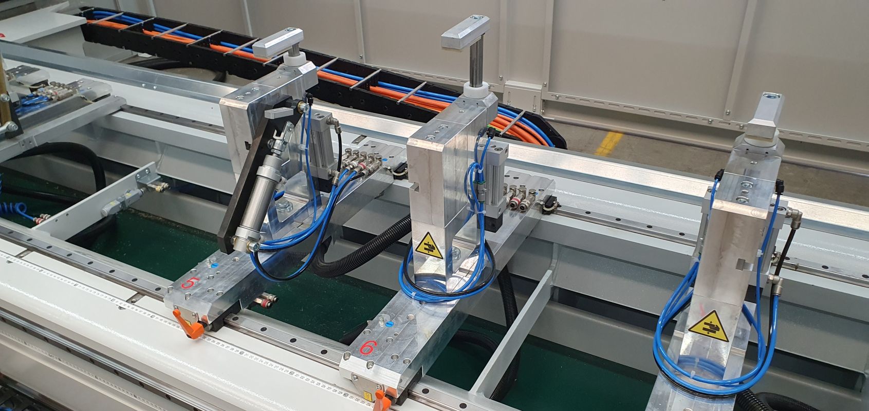Drilling- cutting machine Brand: Comec Type: FIMOV new machine IDEAL MACHINE FOR NARROW PART MACHINING IN THE FURNITURE SECTOR Machine can be combined with drilling units from several sides, Sawing unit for cutting the workpiece to length, optionally inclinable With magazine and automatic workpiece transport to the operator