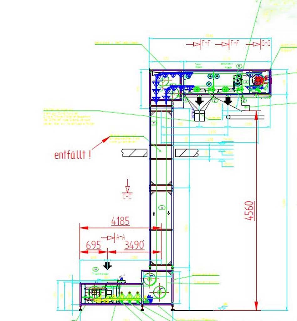 A Wiese pendulum bucket elevator in Z-shape for gentle vertical and horizontal conveying of sensitive, light bulk materials (potato chips) is available. Particle size range: 50mm-60mm, max. conveying material temperature: 30°C, moisture: dry, bulk density: 0.07t/m³, conveying capacity: approx. 14.3m³/h, belt speed: 0.22m/s, max. bucket filling: 60%, belt material: EPDM, bucket width: 476mm, support roller diameter: 95mm. Lower edge discharge: 4960mm, feed vertical shaft center: 3490mm, vertical shaft center last discharge: 1675mm. Documentation available. An on-site inspection is possible.
