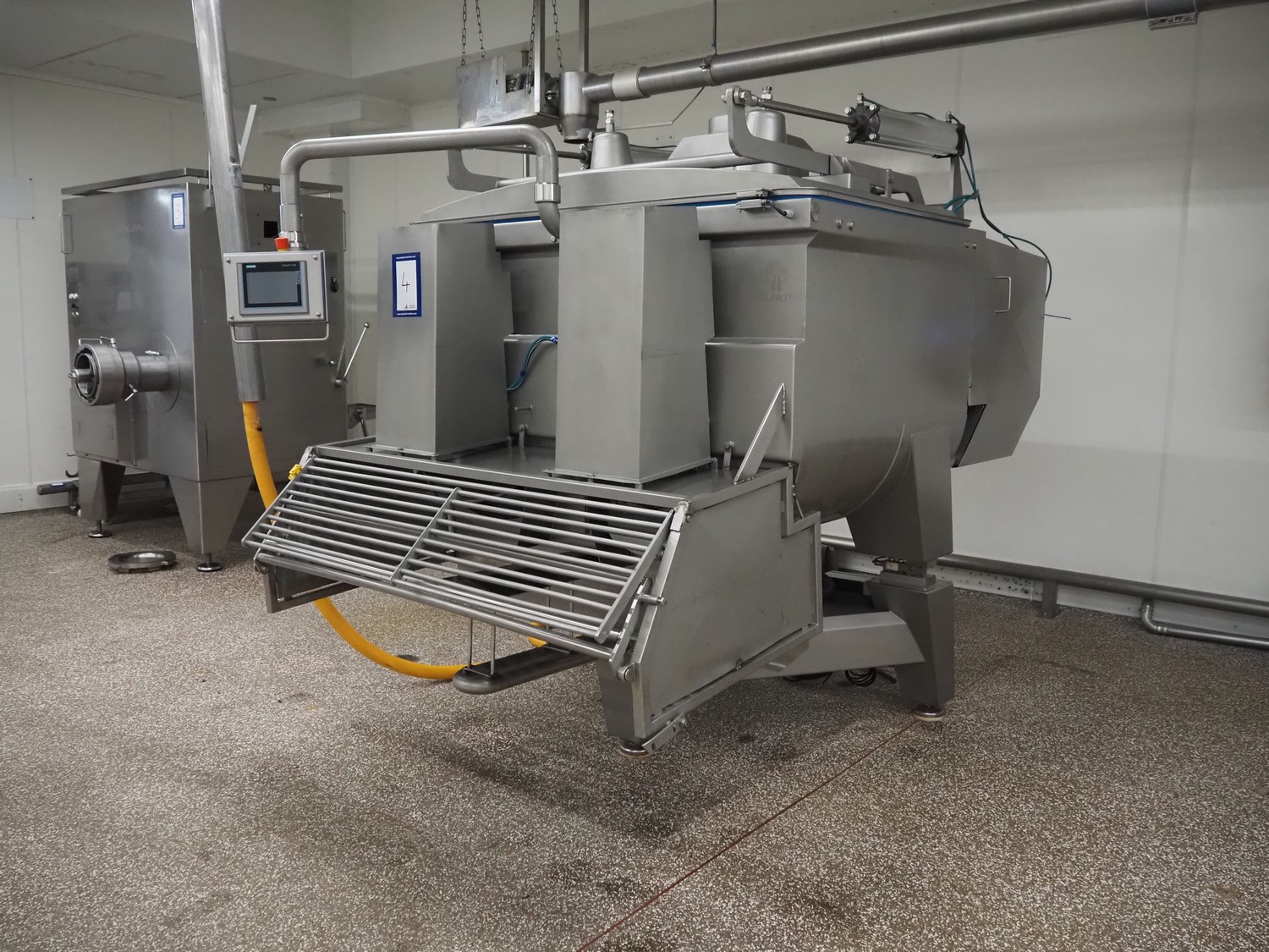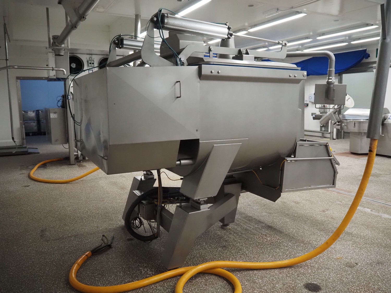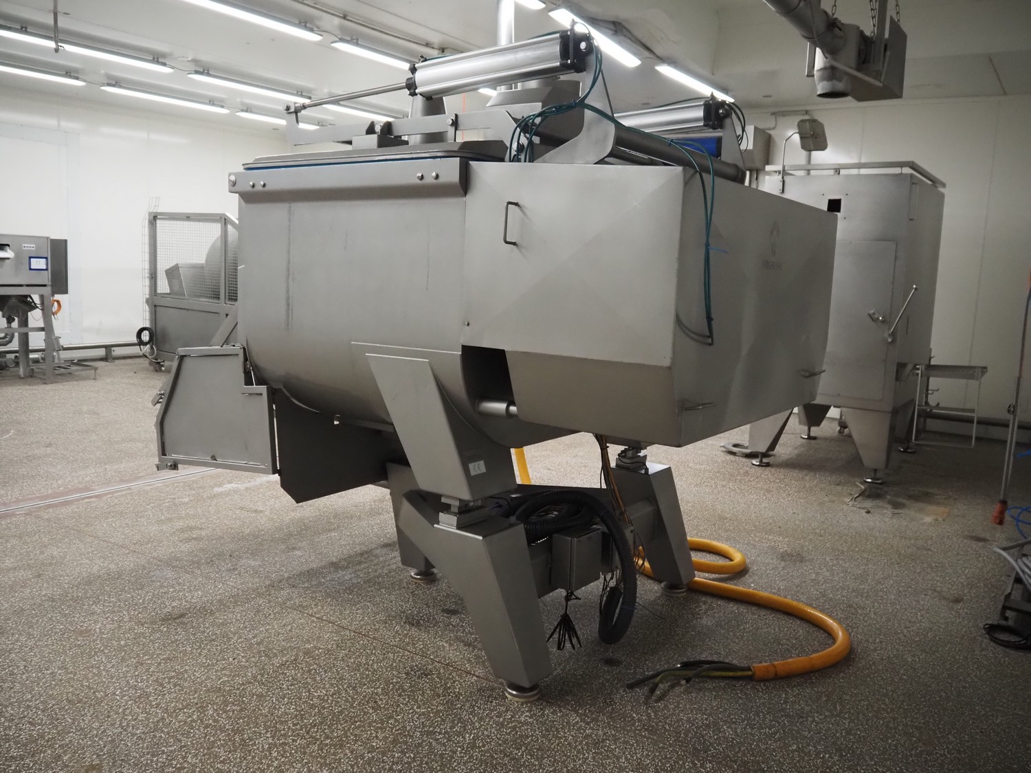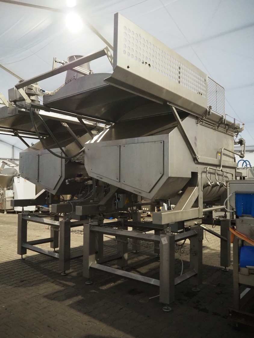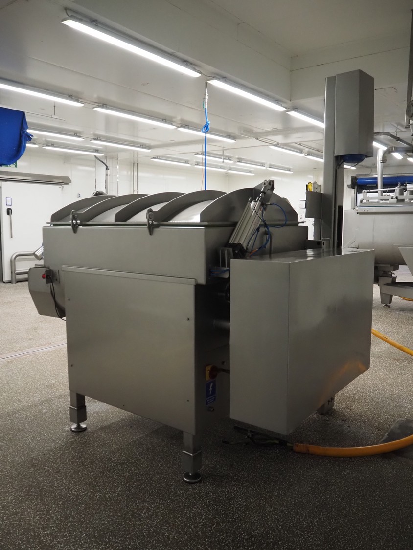 Ekomex double paddle vacuum mixer with lifter for 200 liter meat bins, type: ML-1000V, serial number: 14040801, year of construction: 2018, 3 x 400 V, 50 Hz, 9 kW, Busch vacuum pump, type: KB 0040 D 100, serial number: D16410645, year of construction: 2016, volume: 48 m³ per hour, total dimensions: 2400 mm x 2100 mm x 2700 mm.