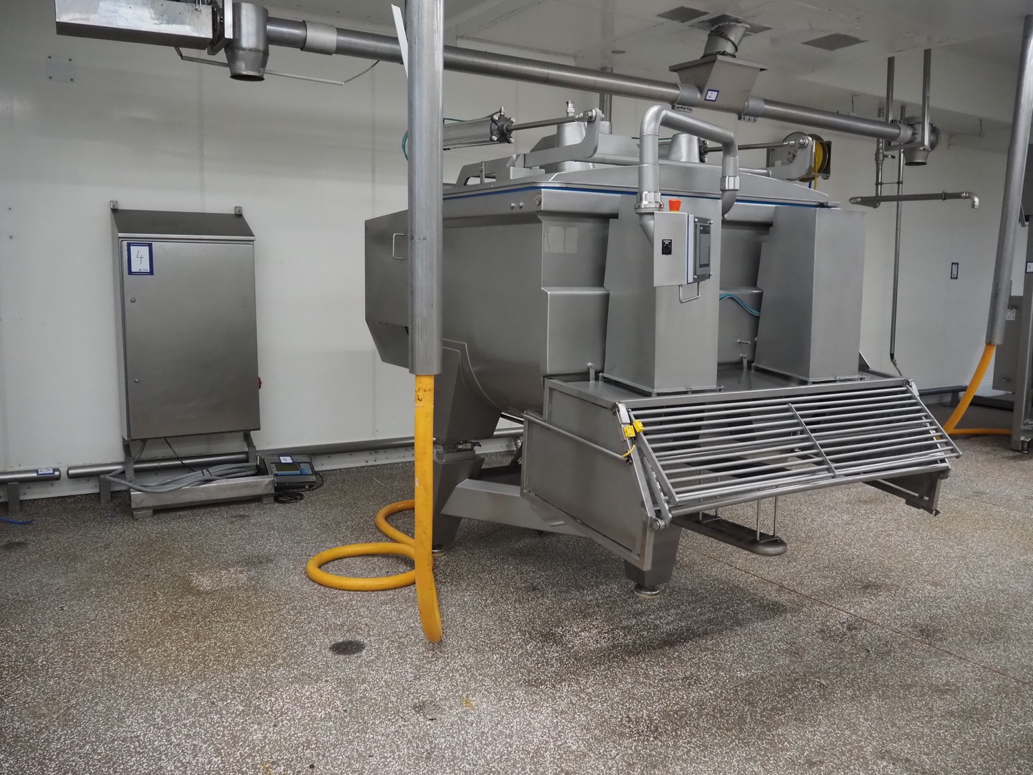 CFS double shaft paddle mixer on weighing cells with switch cabinet, type: UNIMIX 1500L, serial number: 62267, year of construction: 2002, 3 x 400 V, 50 Hz, 11 kW, volume: 1500 liter, infeed height: 1850 mm, outfeed: 800 mm (double meat bin), Flintec SB4-20kN GP-s weighing cells with Bizerba indicator, dimensions mixer: 2600 mm x 1700 mm x 2300 mm.
