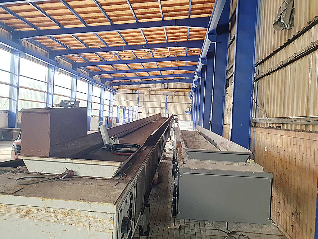 Two heat-resistant flat belt conveyors Integra are available. 1) Center distance: 15200mm, belt length: 15800mm, belt width: 1180mm, overall height: 600mm, belt width: 800mm, max. operating temperature: 130°C, conveying capacity: 30t/h, motor power: 3kW. Including spare edge protection rubber and motor bracket. 2) Center distance: 7500mm, belt length: 8100mm, belt width: 1080mm, overall height: 600mm, belt width: 800mm, max. operating temperature: 130°C, conveying capacity: 30t/h, motor power: 3kW. Including 6× Kito chain hoists. Documentation available. An on-site inspection is possible.