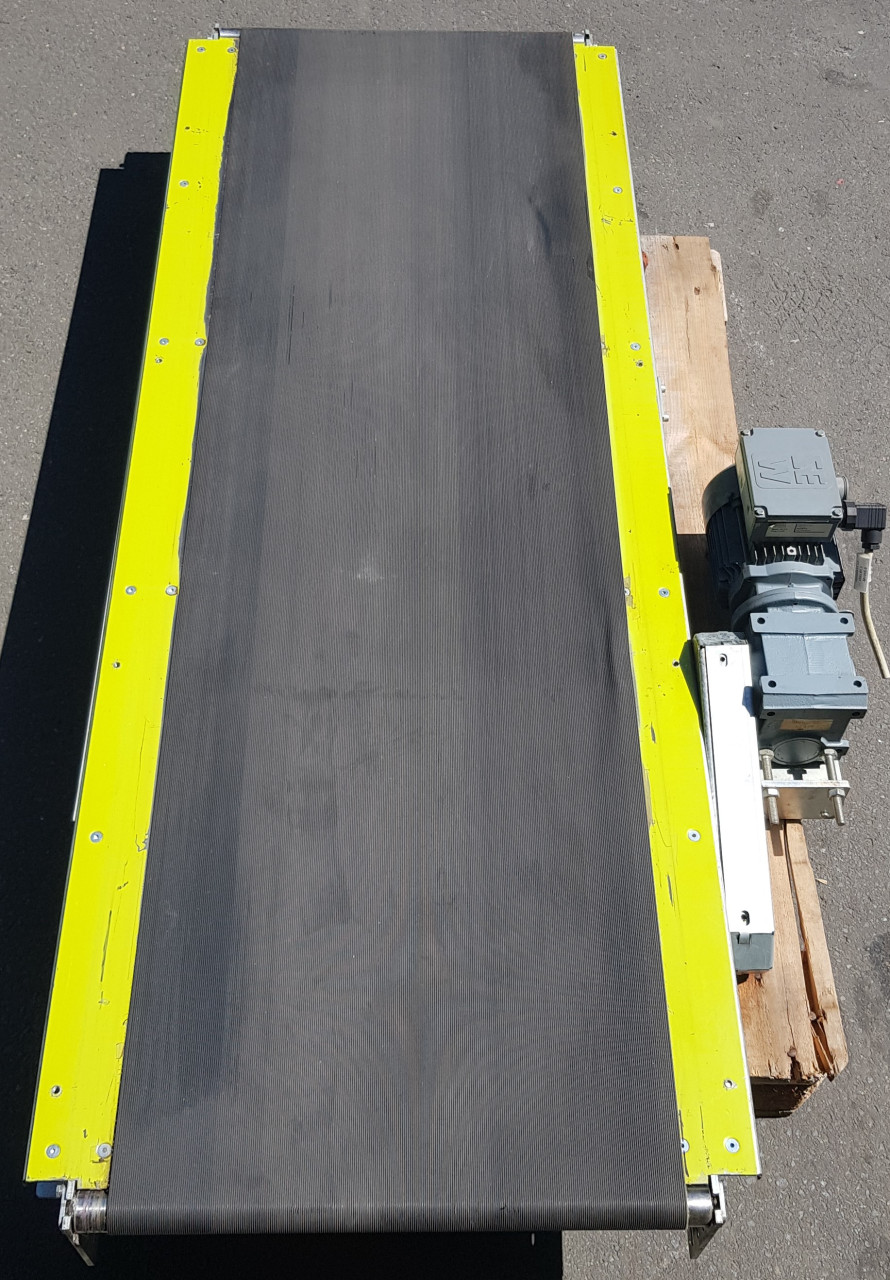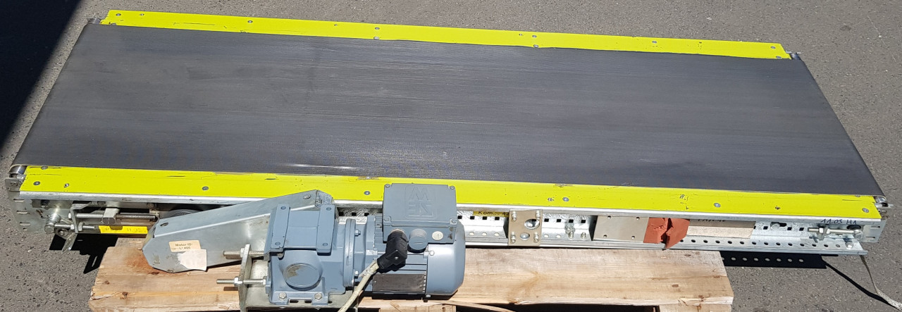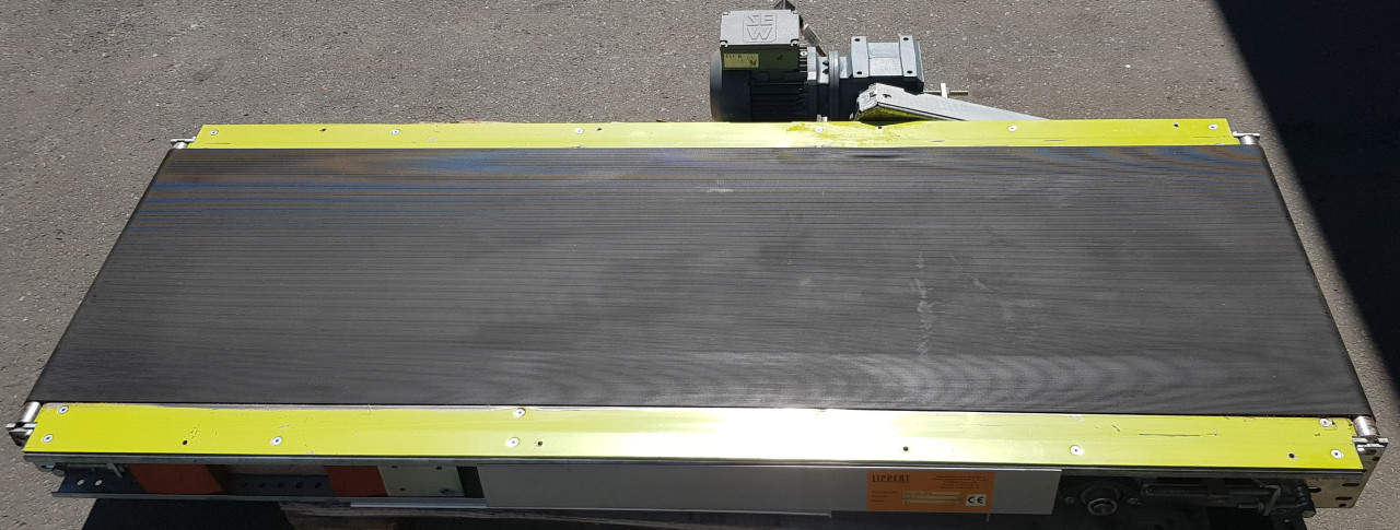 Lippert belt conveyor GF 1715-650-500 RA2484 Technical data: Conveying length (NL): 1715 mm Framework width (NB): 650 mm belt width (GuB): 500 mm height (BH): 105 mm support feet: optionally available Conveying speed (v m/s): adjustable up and down with frequency converter Drive: SEW gear motor R17 DT71D4/MM03/BW1 Electrical data: 50Hz V380-500, kW 0.075 / 0.37 / S1 Deflection roller (UR): Ø = 34 mm Drive drum (AT): Ø = 81 mm Belt: Type SNB-8E Year of construction: 2001 Optionally available: Supports Side guides Prices plus VAT from central warehouse Dr. Sonntag GmbH & Co KG, 97076 Würzburg Features: Construction year: 2001 condition: good (used) Conveying length in mm: 1715 Nominal / outside width in mm: 650 Belt width in mm: 500 Driven: YES Engine type: SEW Eurodrive Zentralantrieb mit Spannstation KW: 0,37/S1 Conveyor speed m / s: freely adjustable scope of delivery: without suppo ...