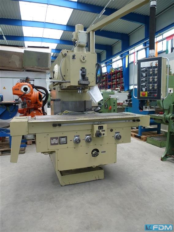 x-travel:500 mm y-travel:400 mm z-travel:330 mm table-size:400 x 710 mm spindle taper ISO:40 quill stroke:100 mm control:HEIDENHAIN TNC 335 table load:180 kg no. of flutes:8 groove width:14/45 mm tool taper:ISA 40 speeds::20 - 3000 /28- 4000 U/min feeds:infinitely variable1-1250 mm/min rapid traverse:5000 mm/min total power requirement:13 kW weight of the machine ca.:2500 kg dimensions of the machine ca.:2000 x 2800 x 2300 mm Documents:inkl. Zusatzinformationen ? Schile-Elektroschrank mit CNC-Steuerung Heidenhain TNC 355 ? Starrer Winkeltisch 710 x 400mm ? Spritzschutzverkleidung / Halbkabine ? Kopf nach Skala präzise drehbar über Kurbel ? Kopf komplett wegschwenkbar für horizontal Spindel