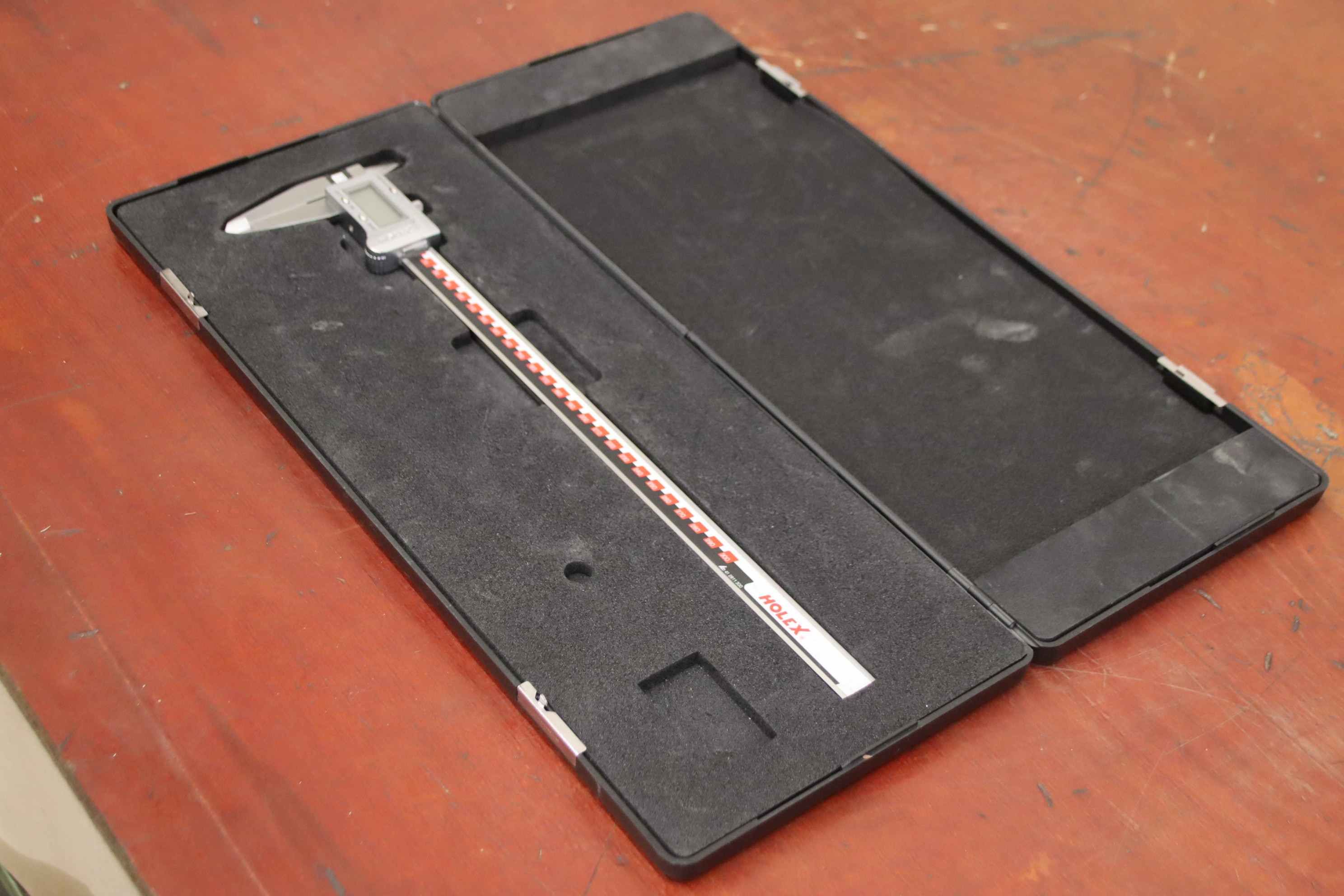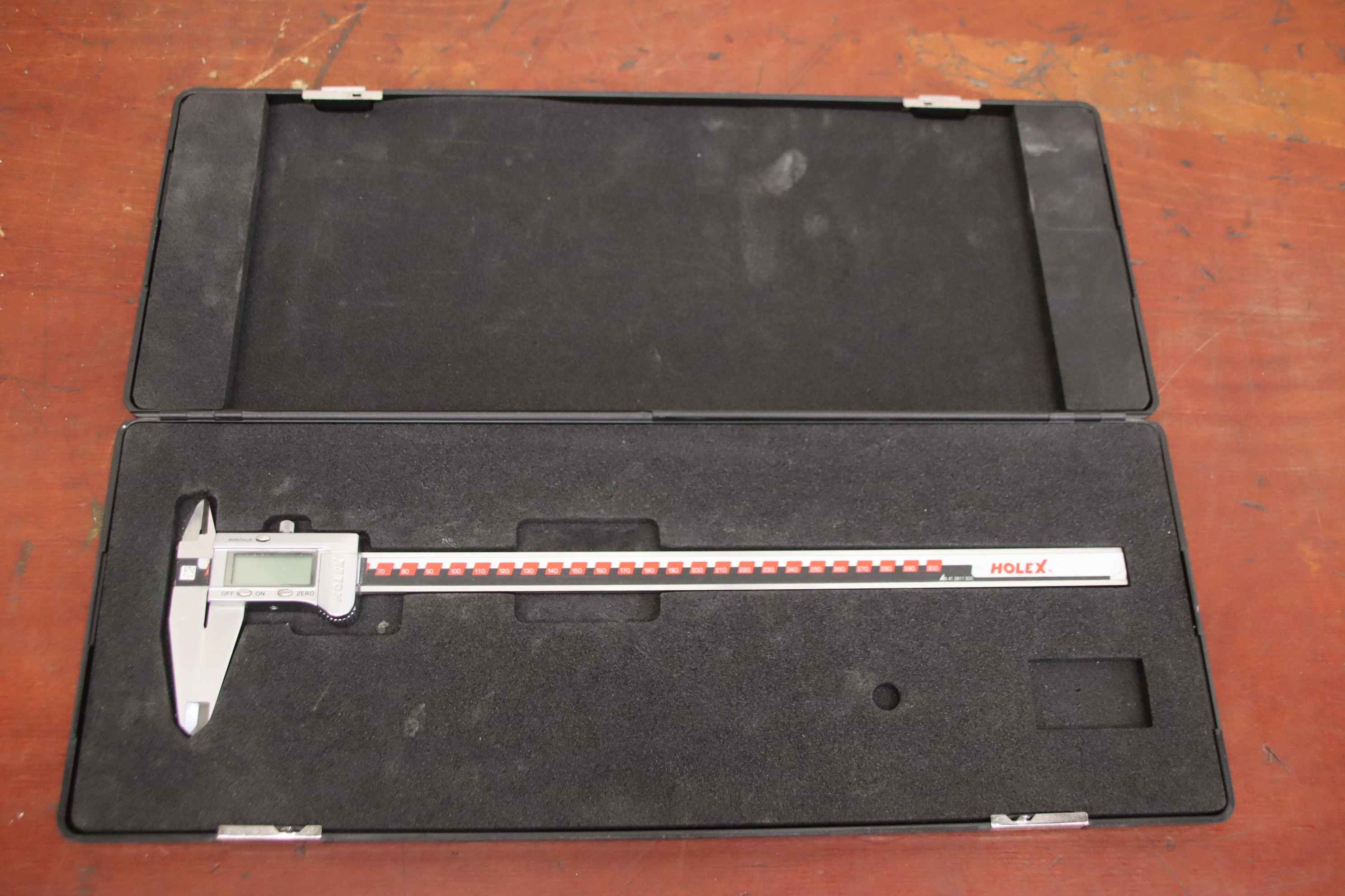 Vernier caliper, caliper, vernier caliper -Manufacturer: Holex, Digital Caliper -Item No.: 41 2811 300 -Measuring range: 0-300 mm -Measurement accuracy: 0.01 mm Quantity: 1 piece available -Case dimensions: 465/180/H30 mm -Weight: 1.0 kg