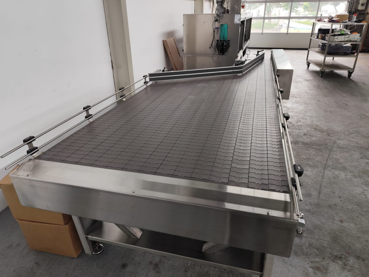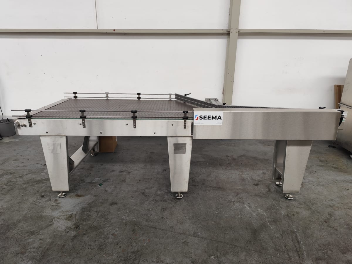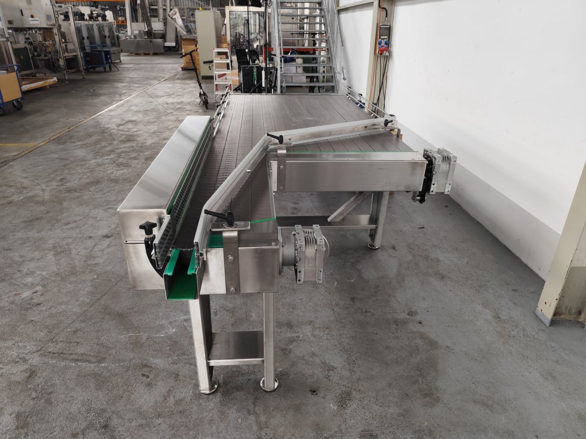 Length 3500 mm Stainless steel structure Complete with - Side guides - Support feet - N° 2 adjustable speed motors - Chains width 82.6 mm - Motorized device with idle rolls for round bottle sliding More then 300 machines new and second hand on our seema .de