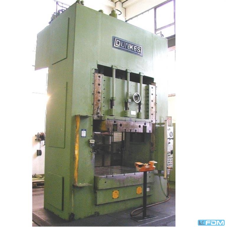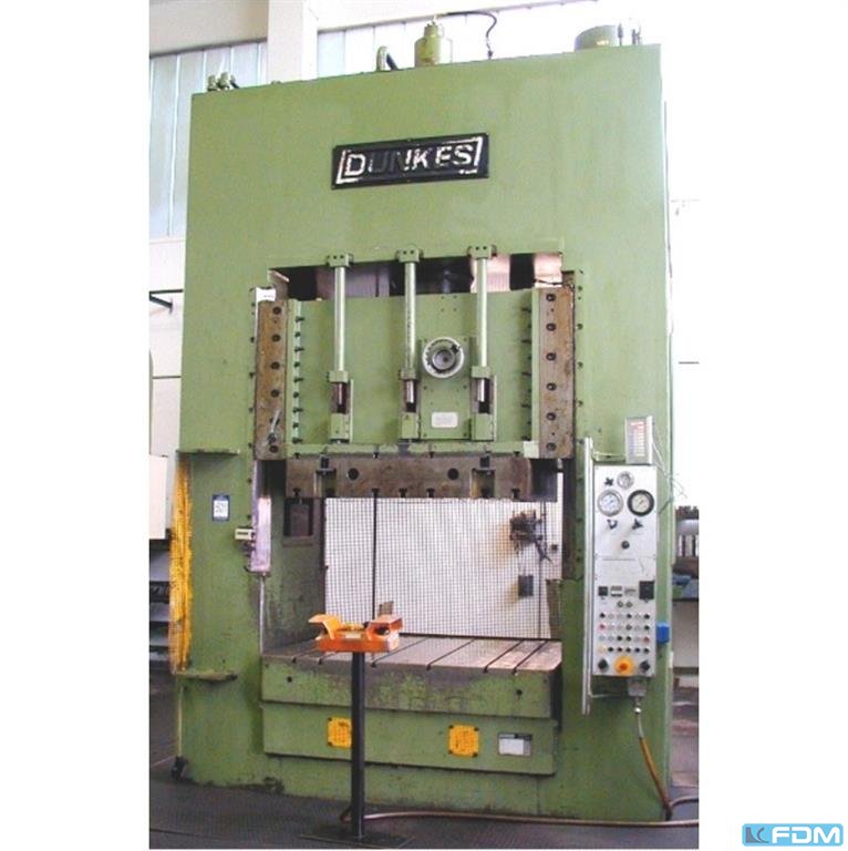 pressure:1000 t distance between columns:3030 mm stroke:350 mm Distance table/ram, max. stroke up, adjustment up:1400 mm table surface area:3000 x 2000 mm table height over floor:430 mm side window:1450 x 1400 mm ram surface:3000 x 2000 mm speed down:300 mm/s speed up:340 mm/s working speed:18 - 44 mm/s return capacity:120 t oil volume:4400 l width with platform:4950 mm power capacity:2 x 90,0 + 10,0 kW weight:87,0 t Dimensions (WxDxH):4,35 x 3,65 x 7,55 m height over floor:6,05 m height beneath floor:1,5 m German Safety: permitted for manual loading:UVV 11.064 - VBG 7n5.2