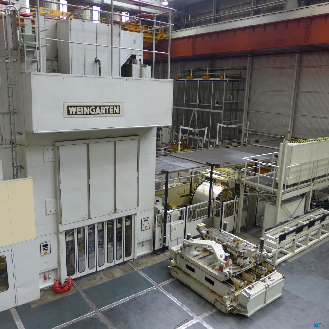 pressure:1000 t distance between columns:3030 mm stroke:350 mm Distance table/ram, max. stroke up, adjustment up:1400 mm table surface area:3000 x 2000 mm table height over floor:430 mm side window:1450 x 1400 mm ram surface:3000 x 2000 mm speed down:300 mm/s speed up:340 mm/s working speed:18 - 44 mm/s return capacity:120 t oil volume:4400 l width with platform:4950 mm power capacity:2 x 90,0 + 10,0 kW weight:87,0 t Dimensions (WxDxH):4,35 x 3,65 x 7,55 m height over floor:6,05 m height beneath floor:1,5 m German Safety: permitted for manual loading:UVV 11.064 - VBG 7n5.2
