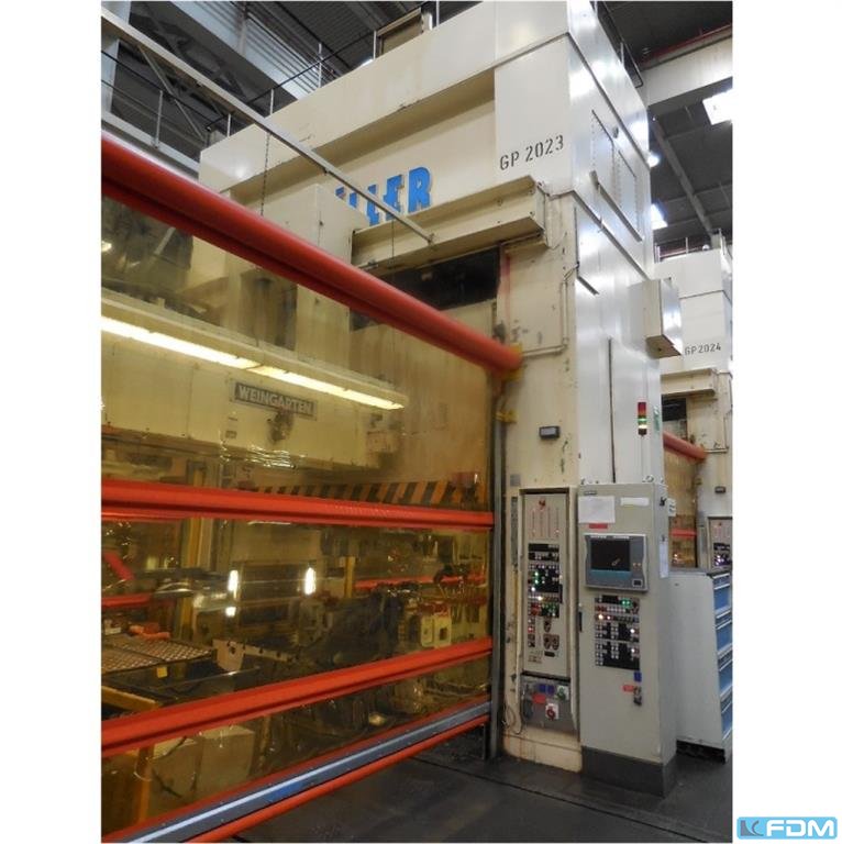 pressure:200 t stroke:30 - 160 mm no. of strokes:40 - 120 /min distance between columns:1500 mm distance between oil collecting pans:1300 mm distance table/ram, max. stroke up, adjustment up:860 mm hole in the table:550 x 300 mm table surface area:1250 x 1250 mm table height over floor:1000 mm column travel -side:600 x 530 mm ram surface:1250 x 1000 mm ram adjustment:125 mm Material width of feeder:30 - 500 mm Material thickness feeder:0,5 - 3,0 mm feeding length:0 - 999,9 mm power requirement:50,0 kW weight:34,0 t dimensions (WxDxH):4,0 x 1,7 x 5,2 m clutch-/ brake combination:pneumatisch, Ortlinghaus overload protection in ram:hydraulisch ram adjustment:automatisch stroke adjustment:automatisch ram counterbalance:pneumatisch roll feed:Weingarten, WE 60 Option: NEW electrical controls:Siemens S7-1500 F