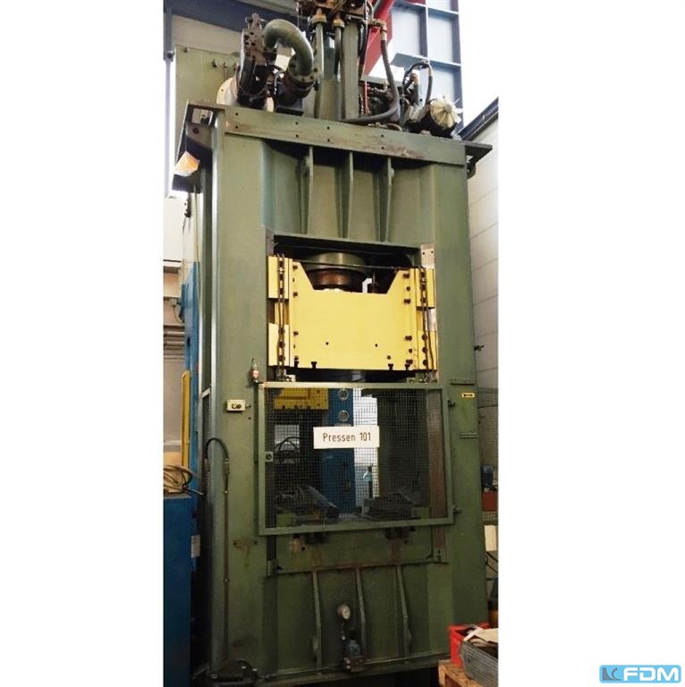 Pressure:63 t distance between columns:1000 mm stroke:300 mm Distance table/ram, max. stroke up, adjustment up:850 mm table surface area:980 x 500 mm table height above floor:850 mm ram surface:130 mm speed down:400 mm/s speed up:461 mm/s working speed:14 - 97 mm/s power requirement:15,0 kW Weight:5,0 t Dimensions (WxDxH):2,0 x 1,6 x 3,9 m depth stop:mechanical foundation pit:not necessary