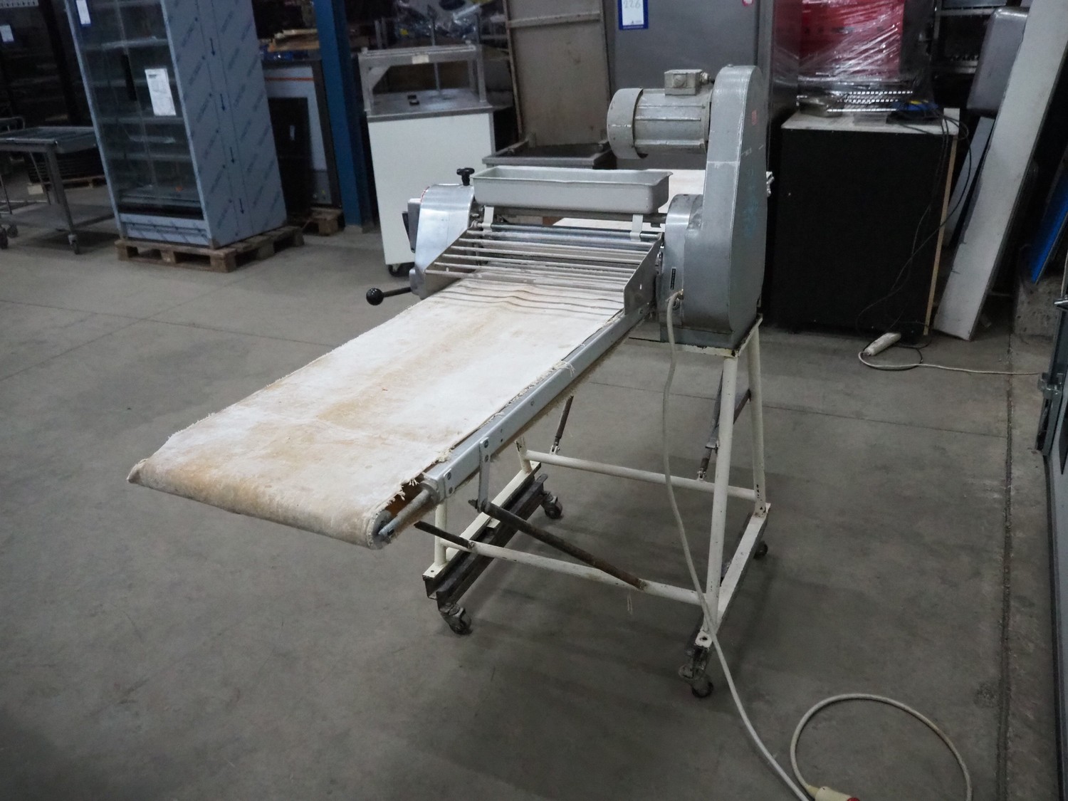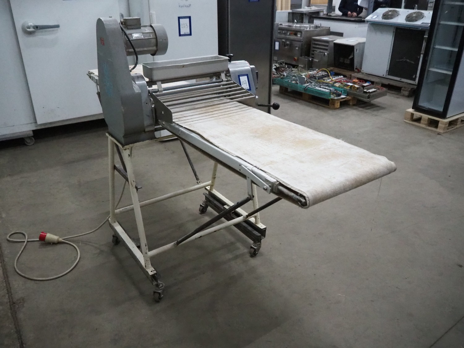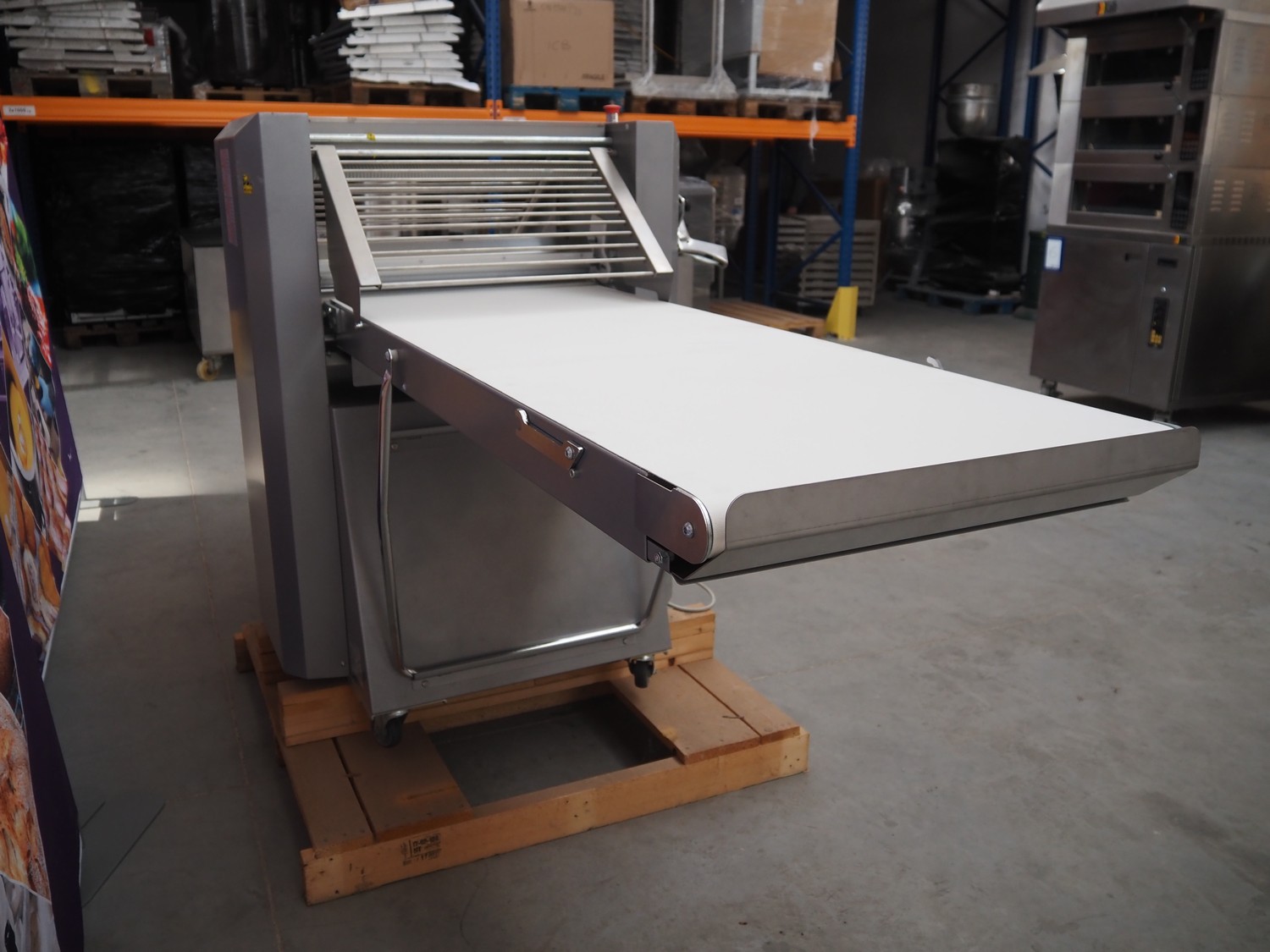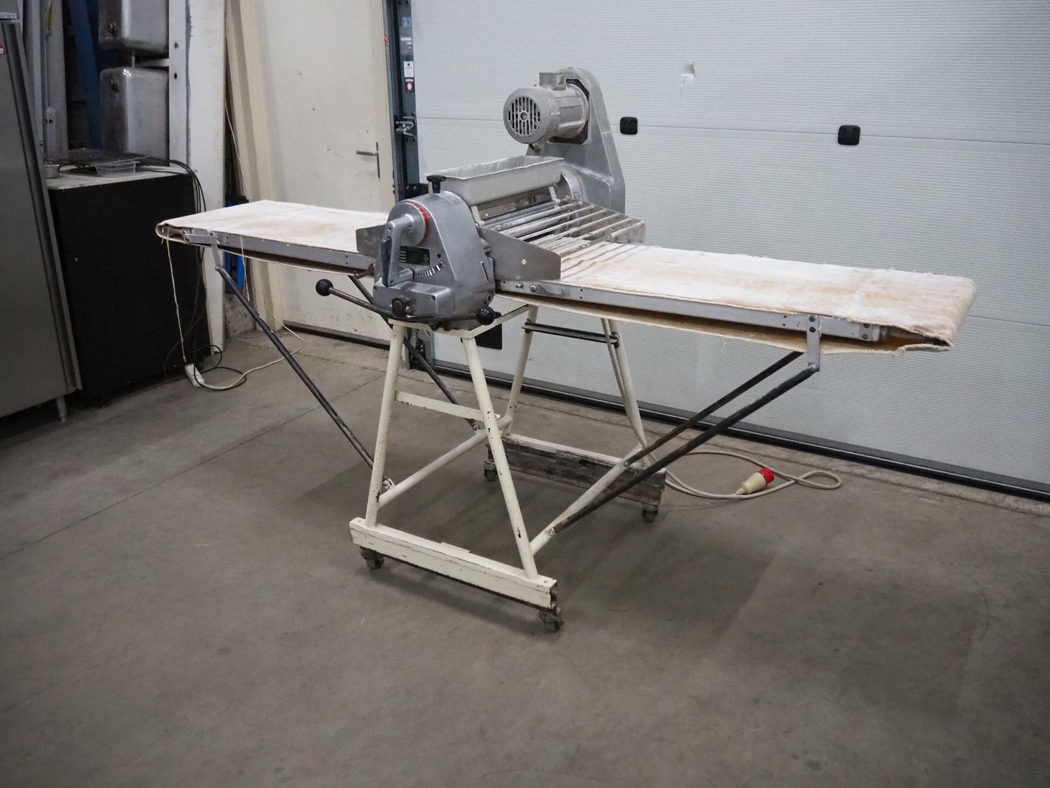 Ram dough sheeter, model: Q600/1500, serial number: 171133, year of construction: 2017, 400 V, 3 Ph, 50 Hz, 2.2 A, 0.75 kW, weight: 190 kg, plastic belt, belt width: 580 mm, working width: 600 mm, total dimensions: 3200 mm x 1100 m x 1300 mm. Never used.