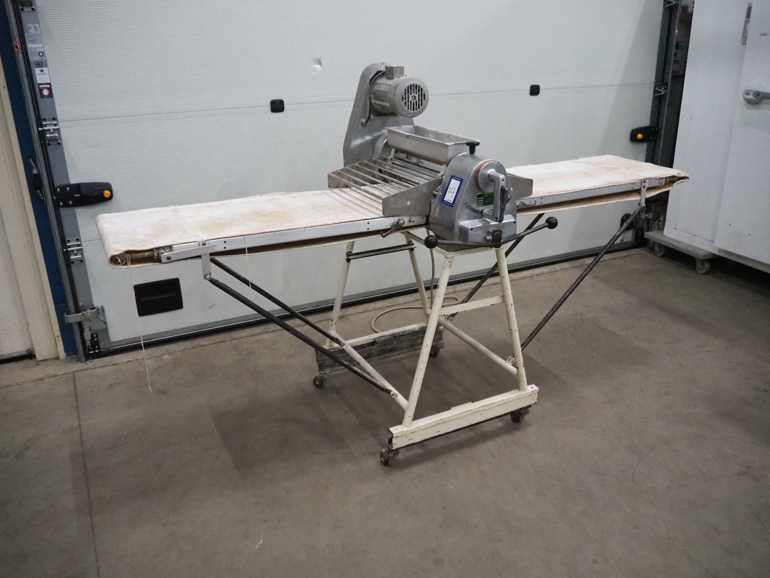 Teknostamp pastry sheeter Serial: 580160101 2016 tabletop pastry sheeter, overall length 2100mm, belt width 590mm, adjustable thickness, 3Ph (missing back cover)