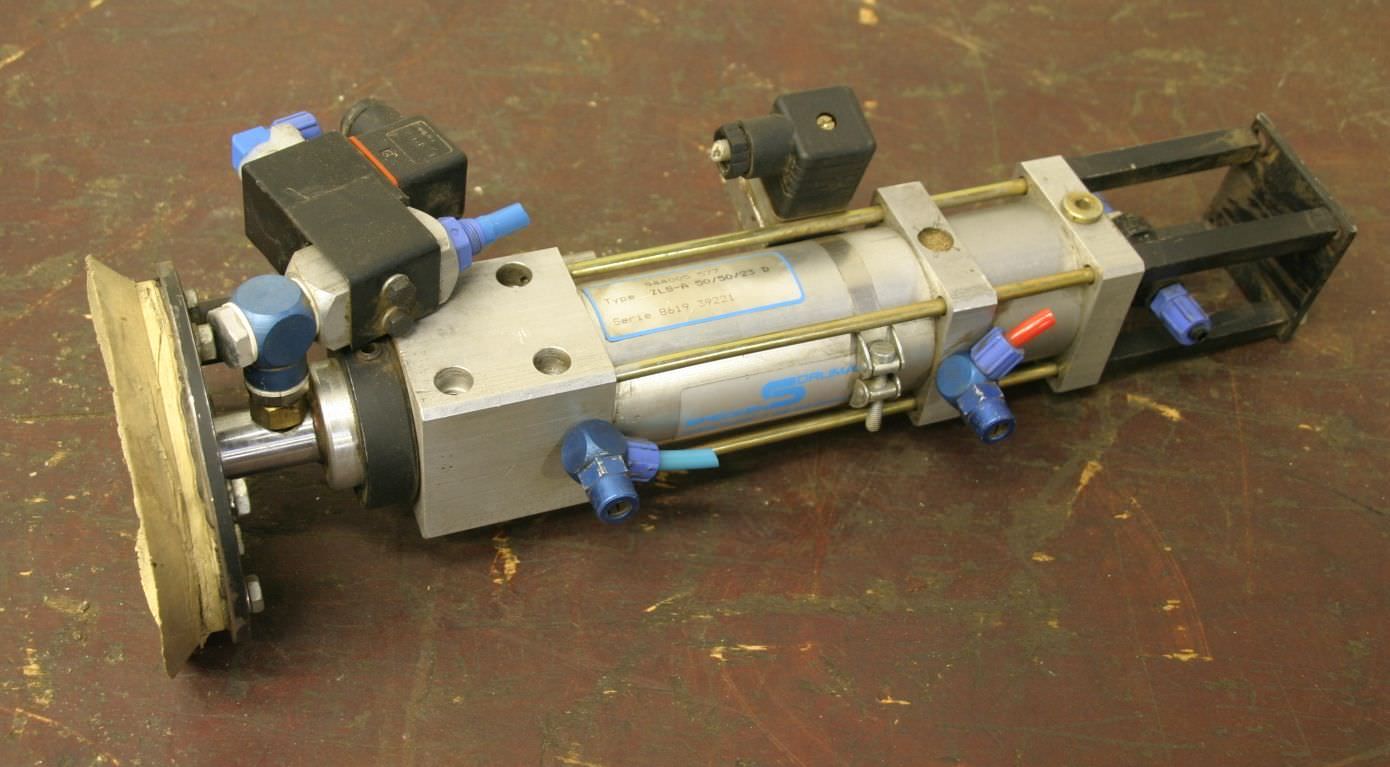 Pneumatic cylinders, air cylinders, pneumatic rams, air rams -Transfer: in the current condition as seen -Vacuum suction cup: with damage -Version: with vacuum suction cup, equipped with directional valve and induction knife for the stroke -Stroke: 70 mm -Sucker: Ø 125 mm -Piston rod: 20 mm -Total length: 420 mm -Total length extended: 490 mm -Number: 31 pieces available -Price per piece -Dimensions: 420/140/120 mm -Weight: 4 kg/piece