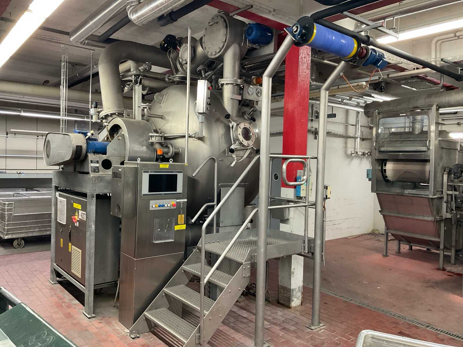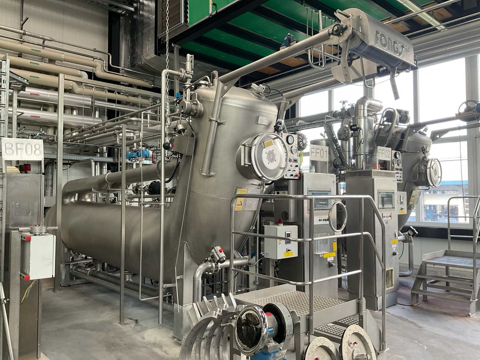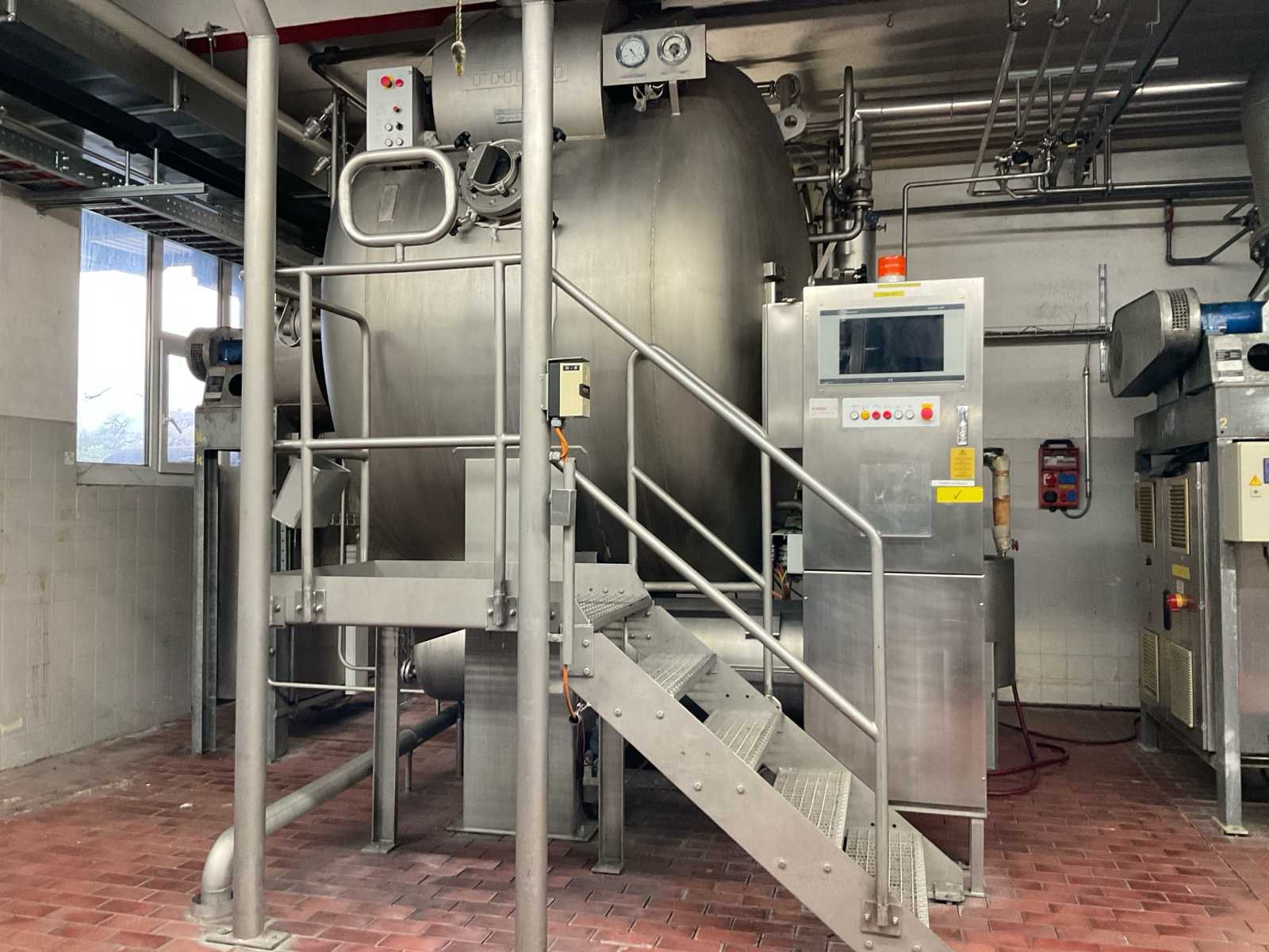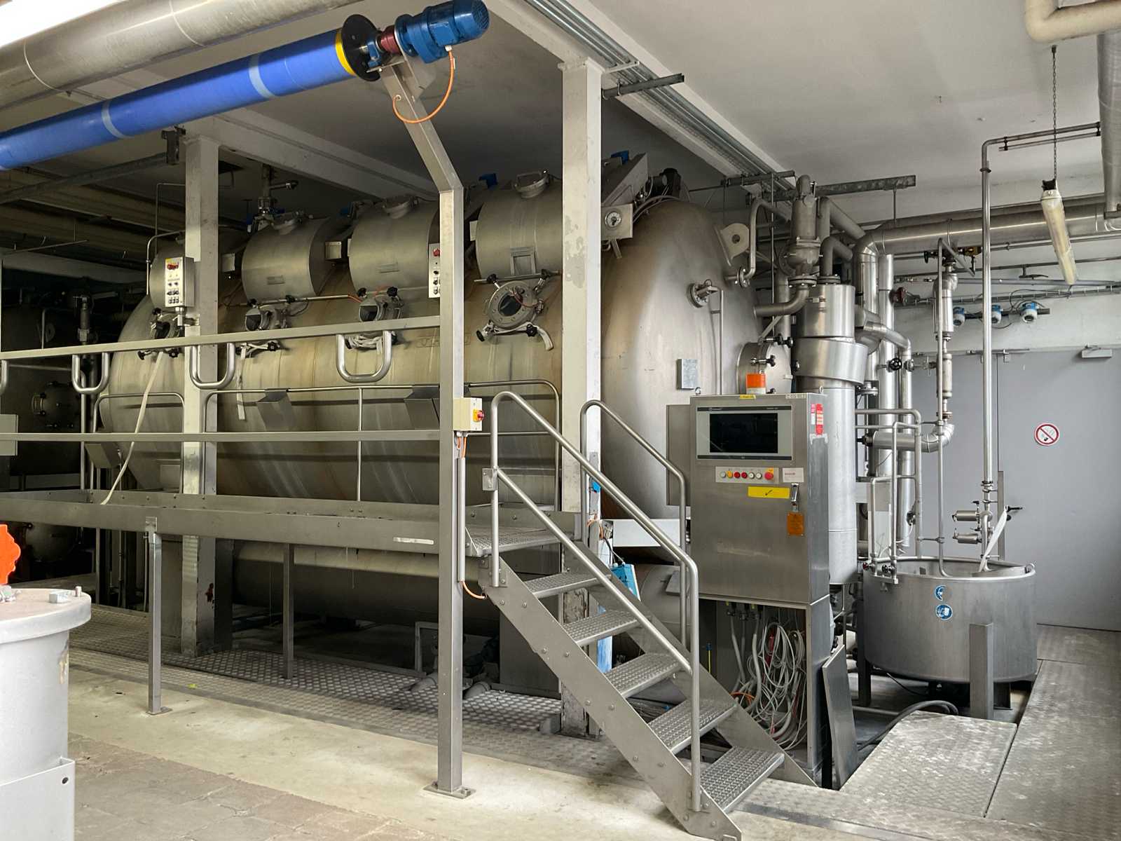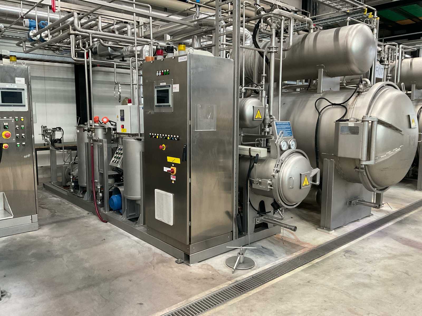 volume approx. 1200/2000 liter, 7 bar, design temp 20-170 degrees, with central main control touch screen SedoThreepoint, Sedomat 8010, open vessel diam. 400 x 750 mm with mixer, 2 open small tanks diam. 32 x 100 cm with pump, ABB control type AX 400, Becatron control box with smart card, dimensions approx. 5250 x 2000 x 3050 mm, on stainless steel frame, valves, combined piping, 2 E+H volume flow counters, etc, BF09, included 3 stainless steel sieves diam. 250 x 2000 mm and 1 stainless steel sieve wagon, reference number #10720 Auction-ID: A1-44567-11