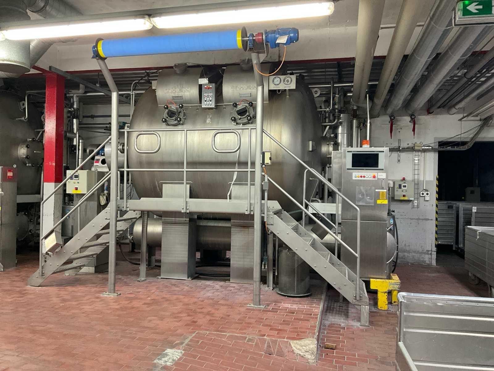 min/max temperature 150 degrees, max. pressure 3,5 bar, volume 24600 liter, test pressure 5,25 bar, main switch cabinet with SedoThreepoint, Sedomat 8015 touchscreen, intended use dyeing, product group 2, with injection filter, pump, open stainless vessel diam. 1050 mm x 650 mm, various valves, combined piping, stainless walking platform, stairs, power cabinet side placed, infeed reel, surface/dimension needed 8000 x 9000 mm, height approx 4000 mm, Then49, reference number #10340 Auction-ID: A1-44567-16