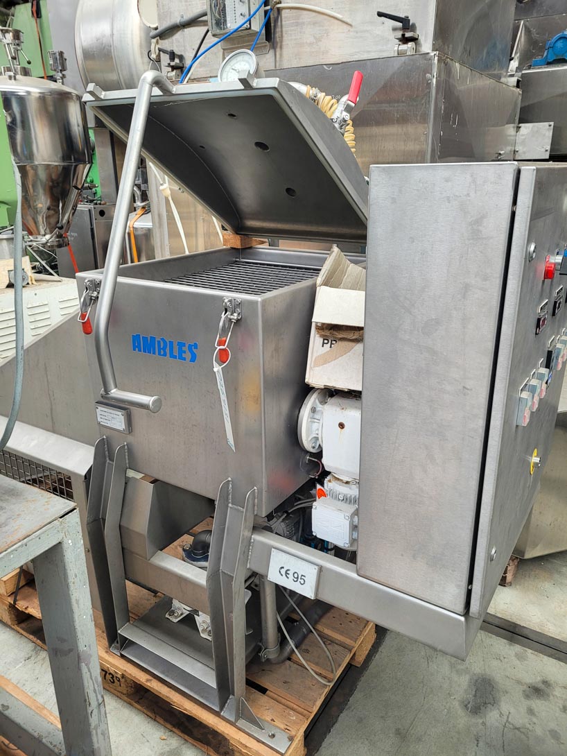 General SKU026A131 MakeAmbles Andeville No.HDA:581 Year of construction9-1995 Mounted on framecheck Pressure Working pressure0 Bar Vacuum possiblecheck Main Features MaterialStainless steel Volume100 Ltr. Motor0.37 KW Specified Features - Ribbon blender Ribbon blender/Vacuum mixer (1x) Double shaftcheck Capacity100 Ltr. Trough sizes500 x 600 x 300 mm With covercheck Outletpneumatically operated With jacketcheck Max. temperature100 °C Motor(2x), 2 Speed (0,37 kW) Speed mixing shaftmax. 75 rpm MaterialStainless steel Information LocationBarneveld With switchgearcheck Floor space1,8 x 1,0 m Total height1,4 m Extra SpecificationsWith vacuum pump (0.75 kW) Ribbon blendersDiscountTea, herbs & coffeeAmbles AndevillMixers > Ribbon blendersDiscountIndustries > Food & Feed > Tea, herbs & coffeeBrand > Ambles Andevill What you can expect from Foeth: -- Machine is in ...