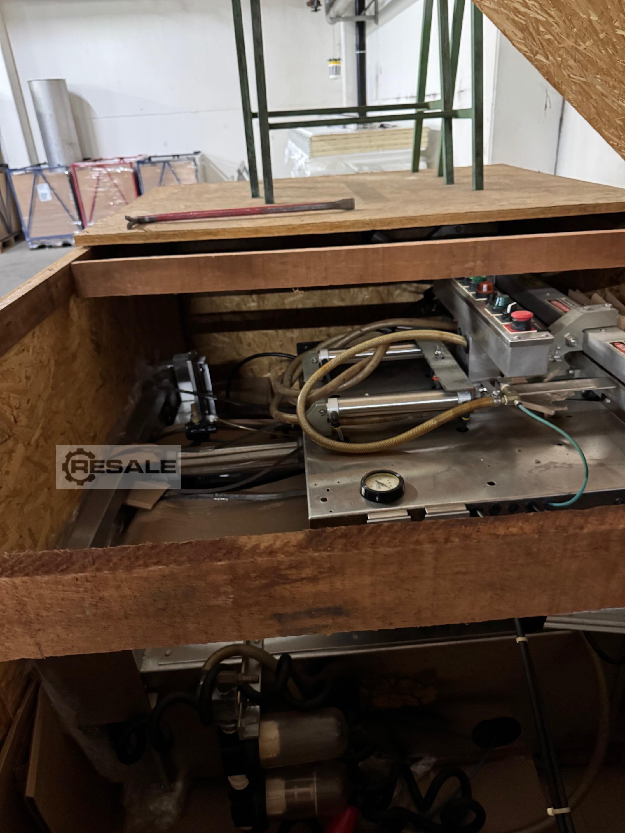 Model: BAS 051. Automatic Flash Butt Welding Machine for Band Saw Blades. Pneumatic clamping. Annealing pyrometer. Inserting bar for blade positioning. UniOp automatic annealing temperature control. Machine cleaned and repainted. Year of manufacture: 2001. Nominal primary voltage: 380 [V AC]. Max. welding rating: 8 [kVA]. Clamping force: 20 [kN]. Forging force: 5 [kN]. Welding ranges. Band saw blades for wood: 6-50 [mm]. Bi-metal bandsaw: 6-41 [mm]. Hoop knives: 6-50 [mm]. Stainless steel bandsaw: 6-30 [mm]. Weight: 600 [kg]. Dimensions (WDH): 135010001700 [mm]. Instructions and packing included.