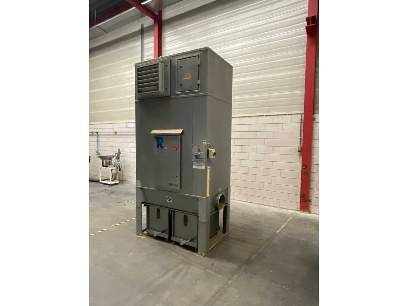 Holtrop Jansma-AFS clean air extraction with compressed air cleaning, auger discharge, rotary lock, chip fan, return air with summer/winter gate valve and fire protection device Type: OSFS 185 Year of construction: 2005 (2015 new turnstile and new control system) Clean air extraction Suction supports: ø700 mm + ø700 mm Length: 3,500 mm Width: 2,300 mm Height: 6,200 mm (onderbak 2,700 mm + bovenbak 2,700 mm + 800 mm fans) Capacity: 21,000 m3 /hour Chip fans: 2 15 kW, 380V, 56 Amp, 10,500 m3/uur, 3,000 tpm, 3,850 Pa, Type: RL E 550130 Filter surface: 185 m2 Filter tubes: 150 stuks Length of filter tubes: 2,200 mm Diameter of filter tubes: 180 mm Cleaning: Compressed air cleaning Flame protection: Sprinkler installation with fire brigade connection Screw: HJ STH-380 12 tpm Turnlock: HJ ZRS-300, 31 tpm Hopper dimensions: 250350 mm Transport fan: Connection diamet ...
