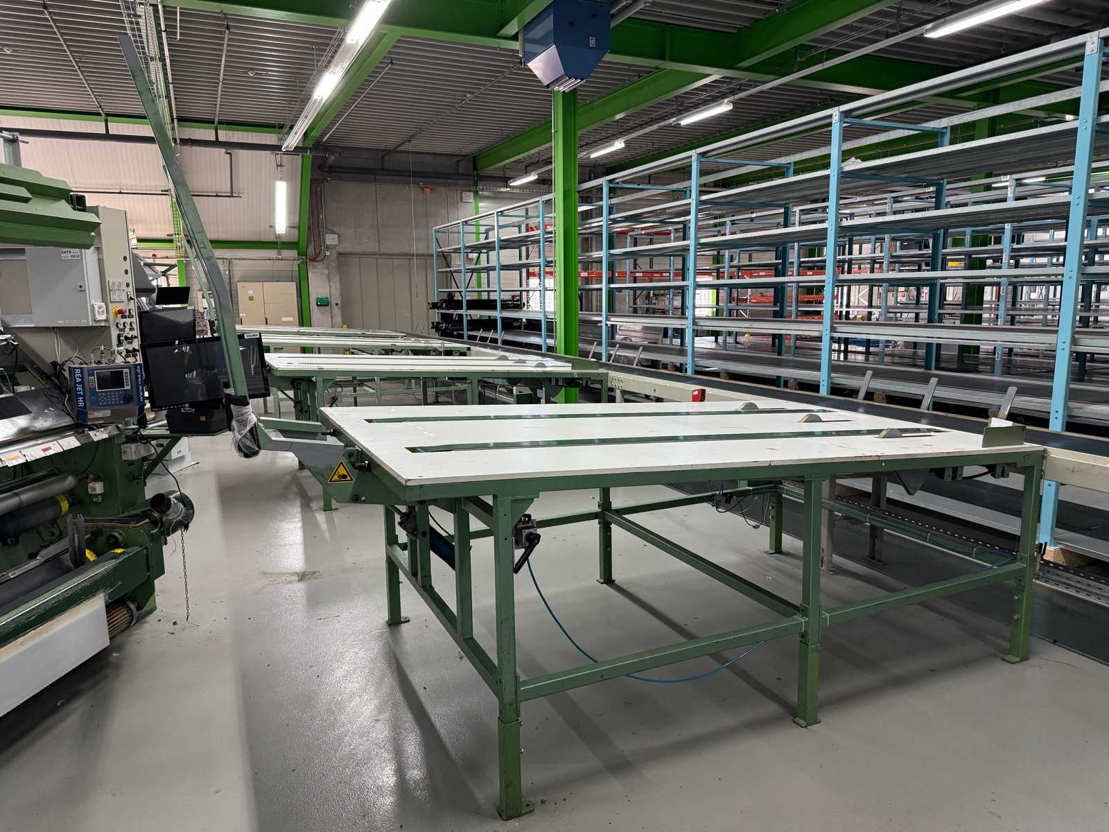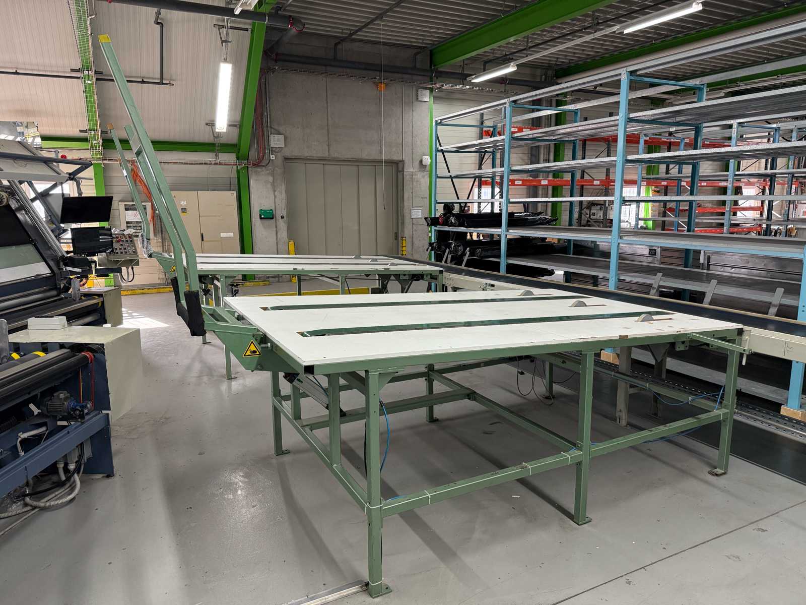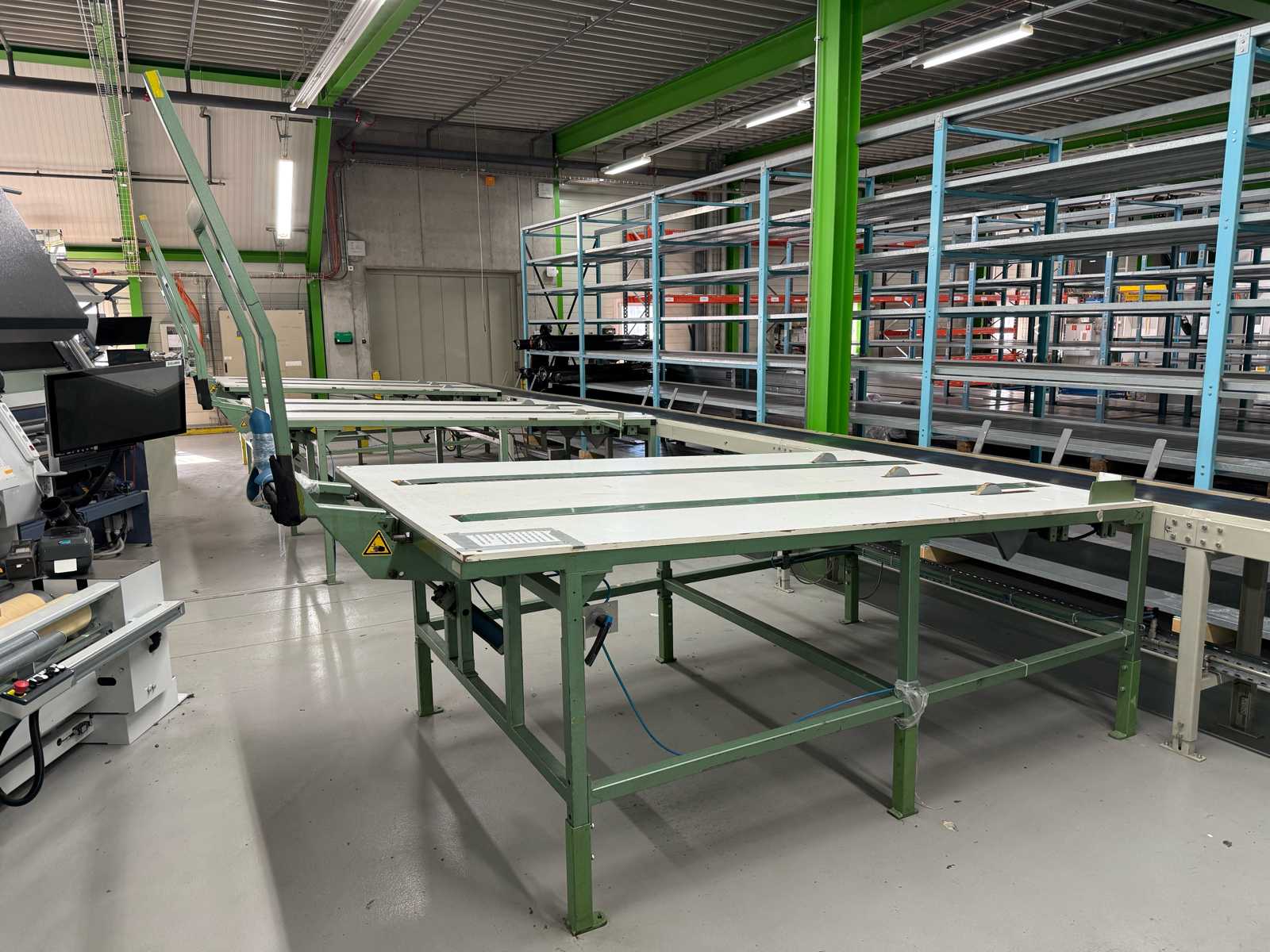 In/out feed table belt driven; Equiped with: pneumatic lifting arm; Approx. dimensions table lxwxh: 3000 x 1800 x 1230 mm Total approx. dimensions lxwxh: 3800 x 2040 x 2770 mm Auction-ID: A1-44567-91