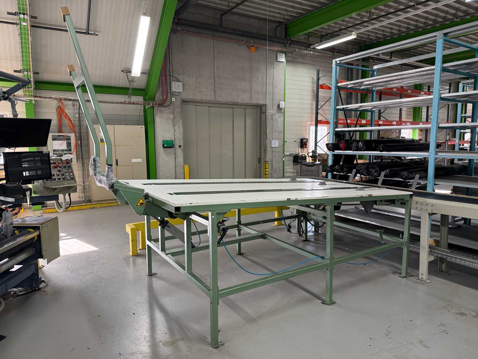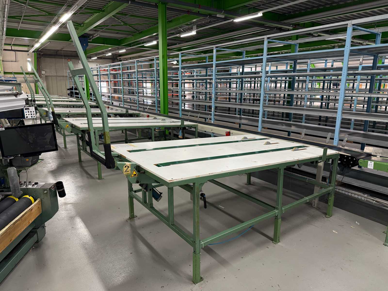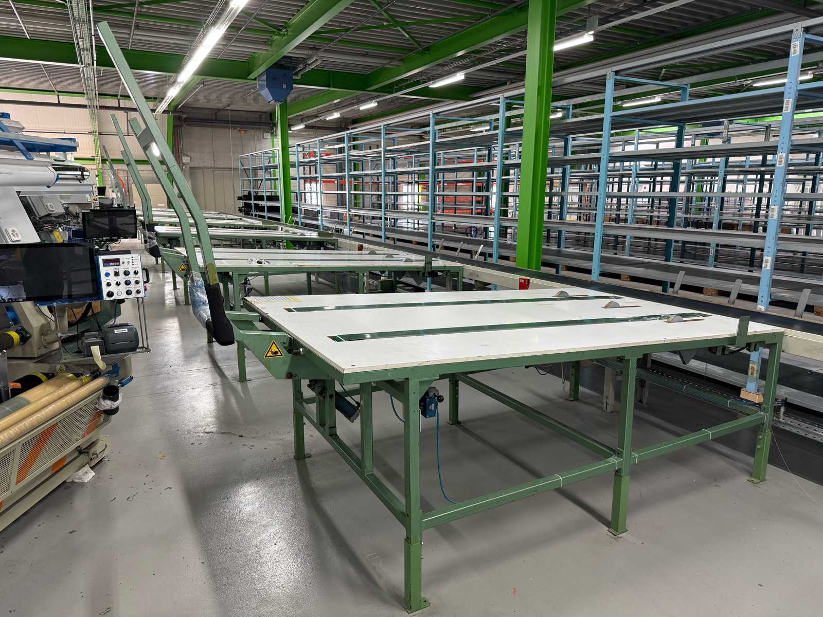 In/out feed table belt driven; Equiped with: pneumatic lifting arm; Approx. dimensions table lxwxh: 3000 x 1800 x 1230 mm Total approx. dimensions lxwxh: 3800 x 2040 x 2770 mm Auction-ID: A1-44567-91