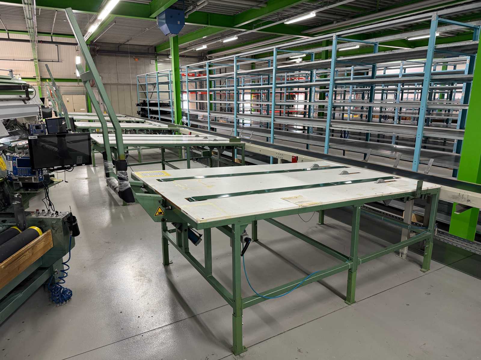 inclined glass table inspection window dimension 1600 x 600 mm, total table size approx. 1800 x 1500 mm, with Iiyama-Prolite screen, on stand, side placed switch box, steel frame and driven in/out feed roll, total dimension approx. 2500 x 2000 x 2000 mm, reference number #10111 Auction-ID: A1-44567-109