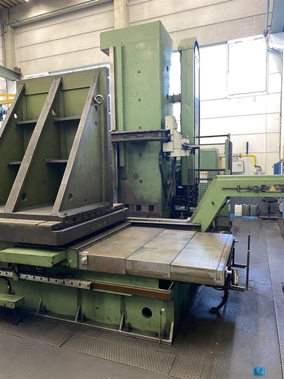Union boring mill CBFK 150/2 from 1990 for sale. Is currently still in use,. Technical details / accessories / addition: x-travel 3000 mm y-travel 2000 mm z-travel 1600 mm Spindle diameter 150 mm Spindle holder ISO 50 Spindle stroke 700 mm Spindle speeds - infinitely variable 5 - 2500 rpm Rapid traverses 10000 mm/min Table clamping area 1600 x 2000 mm Workpiece weight approx. 20 t Spindle drive motor 50 kW Feeds x/y/z - infinitely variable 1 - 9999 mm/min Table positioning 360,000 ° Total power requirement approx. 70 kW Machine weight approx. 40 t Dimensions approx. 6.0 x 8.0 x 4.5 m In 2005: new 5-axis CNC control Dr. Heidenhain TNC 430 - electron. Handwheel HR 410 for all axles with V24 interface, punched tape reader, new electrics, new hydraulics, new servo motors, 60-speed chain tool change magazine model WM III k02 B-axis (round table adjustment) 360,000 ...