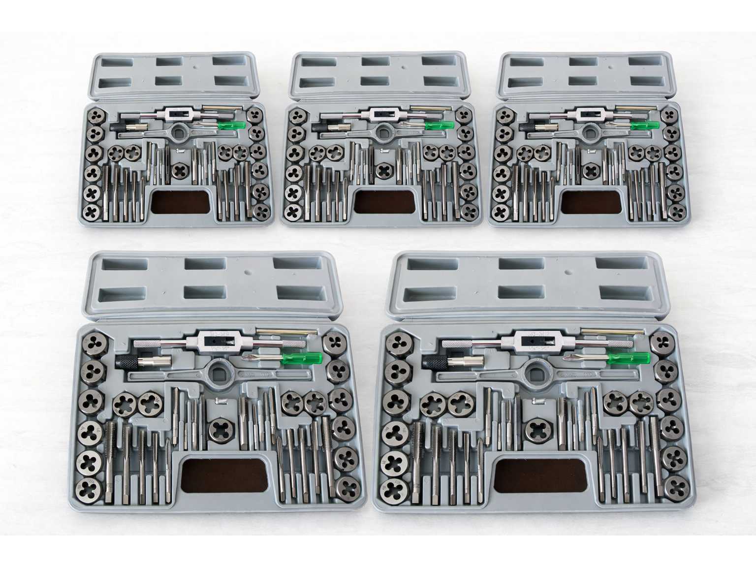 5 UNITS/SETS OF ATT0035 PACKED TOGETHER. A SINGLE ATT0035 CORRESPONDS TO: TAPS AND DIES SET 40 pcs. Professional set made of heat treated steel alloy. Taps and dies suitable for making threads on mild steel and aluminium. Supplied with key for taps and tapping bits. Protective case for transport and to always have them in order. Machine condition: unchecked. Approx. Transport dimension: LxWxH 330 x 210 x 50 mm; Approx. Weight: 2kg The item for sale may not be the one shown in pictures, but will have equal specifications and performance. TOTAL APPROX. DIMENSIONS OF THE LOT WITH 5x ATT0035 PACKED TOGETHER: 330 x 1050 x h50 mm - 10 kg. PACKAGING WILL BE PERFORMED DEPENDING ON WEIGHT AND DIMENSION. Auction-ID: A7-45363-100