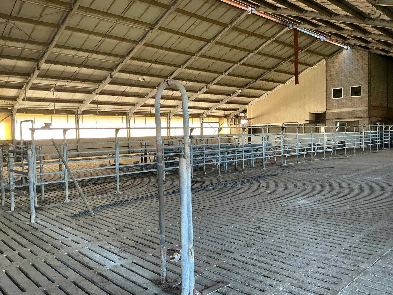 Consists of: herding fence 10200 wide, height 1900mm, rubber strip underside for manure removal, electrically driven, height rail track 1960mm, one side on galvanized legs with sketch plate, one side mounting on rafters, passage height under rack up 2000mm, 2 control boxes, section fences on legs 1500mm c.t.c., total length 36200mm, already disassembled, Auction-ID: A1-40133-85