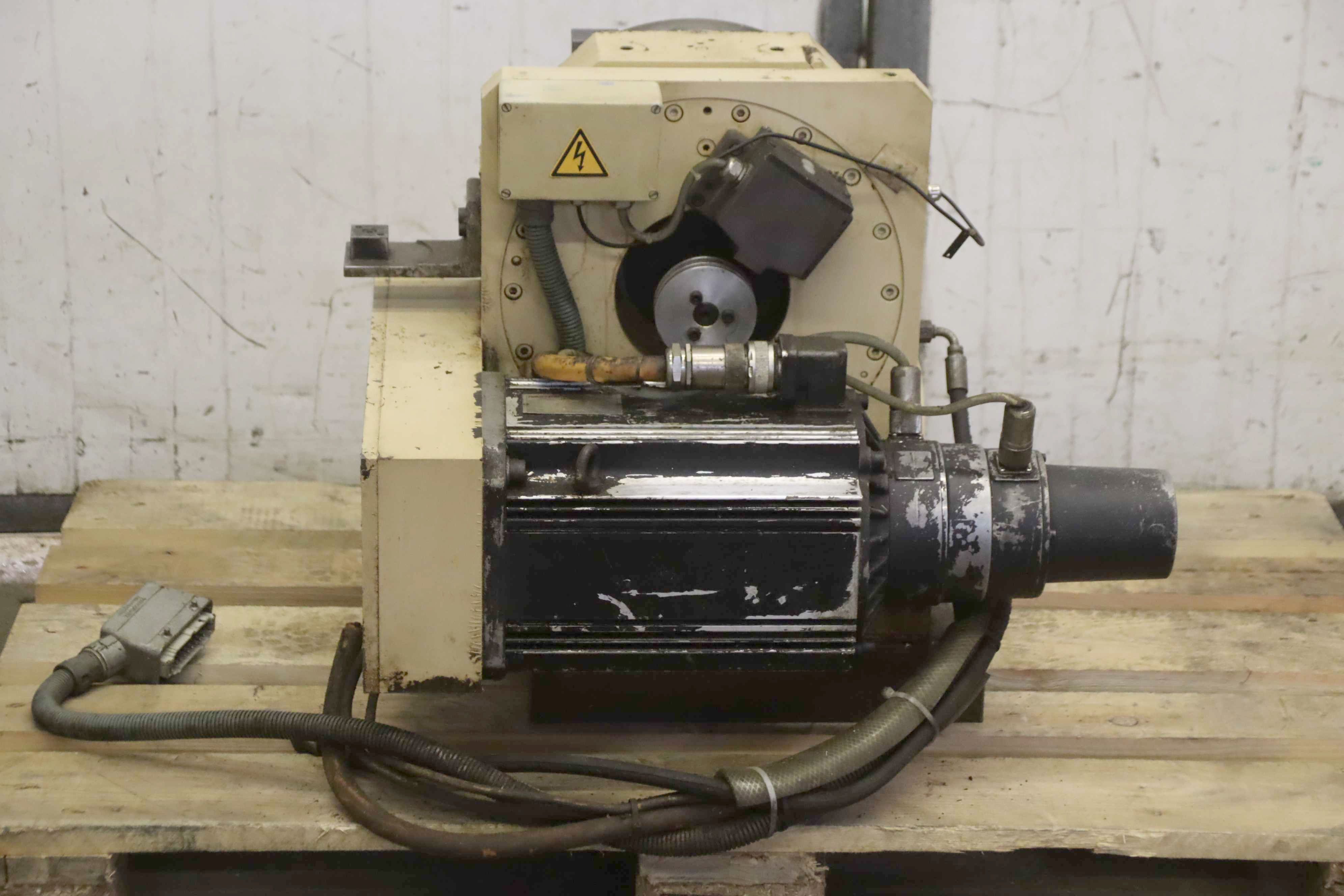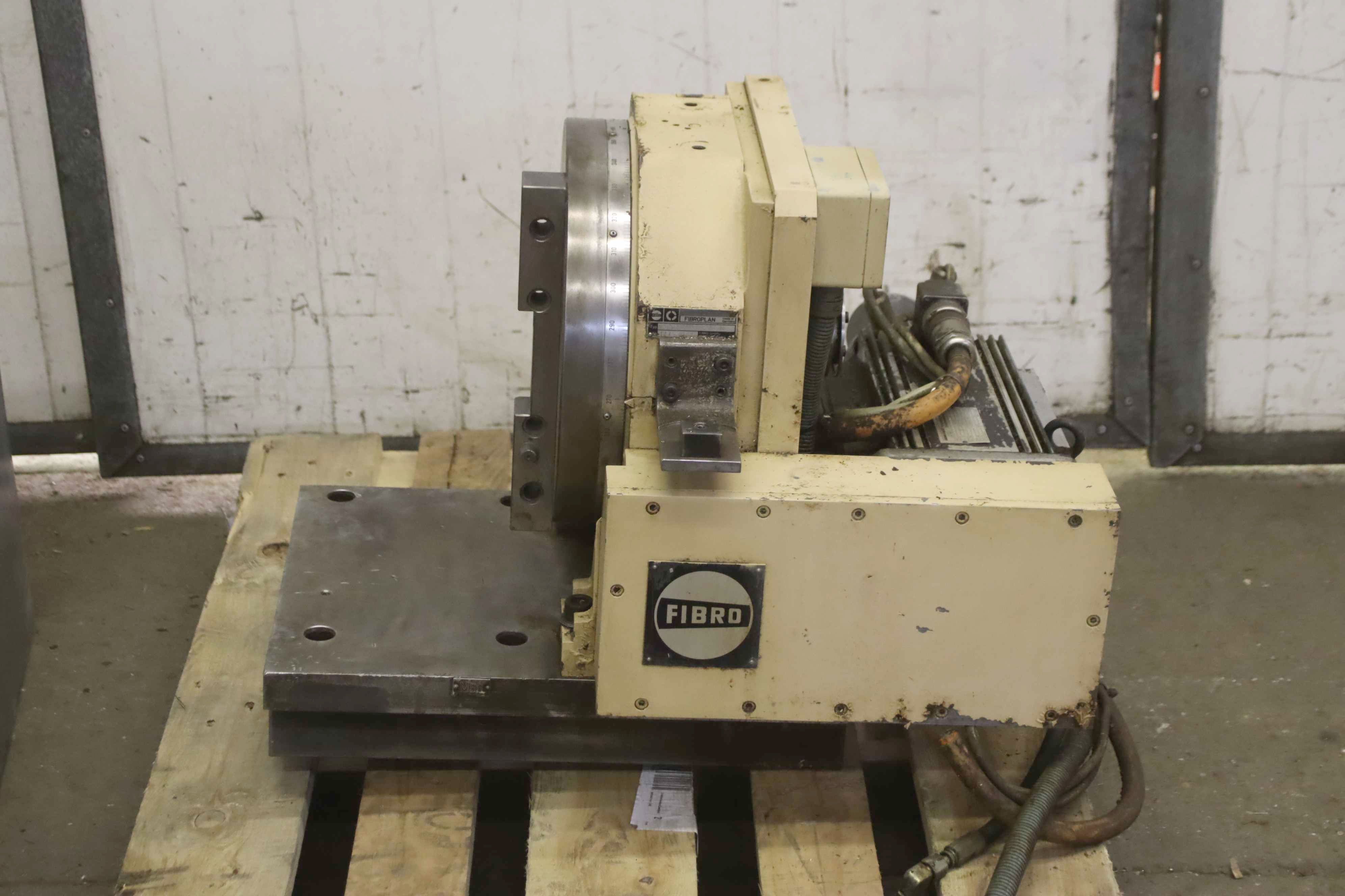 Reversible clamping device, 4th axis, rotary table, rotary indexing table, controlled rotary table, dividing head, dividing head, rotary indexing table, rotary coupling -Manufacturer: Fibro, Fibroplan rotary table with drive -Type: NC1.03.0340.1.1.04.04 -Table diameter: 340 mm -Clamping: hydraulic -Drive: Indramat servomotor type 112B-0-LD-4-C/180-A-0/Wi533LX/S011 -Number: 2x round table available (one of which has a base plate) -Price: per piece -Dimensions: 660/640/H550 mm (with base plate) -Weight: 420 kg (with base plate) /pc.
