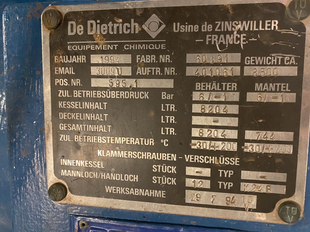 General SKU264W376 LocationBarneveld CEcheck MakeDe Dietrich TypeBE4000 Pressure Working pressure6 Bar Vacuum possiblecheck Working pressure jacket6 Bar Vacuum possible jacketcheck Main Features MaterialGlass Volume4000 Ltr. Specified Features - Glass-lined Reactor MaterialGlass - Enamel (3009) Glass Reactors Reactorcheck Capacitybruto 5381 l, (netto 4000 l) Vessel sizesDia. 1800 x 2000 mm Dished bottomcheck Dished top sidecheck ManholeDN600 Top connectionscheck OutletDN100 With jacketcheck Max. temperature-25°C/ +200°C With propellor stirrercheck Without motorcheck Information No.64182 Year of construction2001 Floorspace2,4 x 2,4 m Total height3,4 m Weight6500 kgFine chemicalsOther chemicalBiotechnologyAgrochemicalsCatalysts & fillersGlass-lined ReactorsSolventsDetergent & surf.Other pharmaceuticsCosmeticsLubricants & oleoSolid pharmaceuticsDyes & pi ...