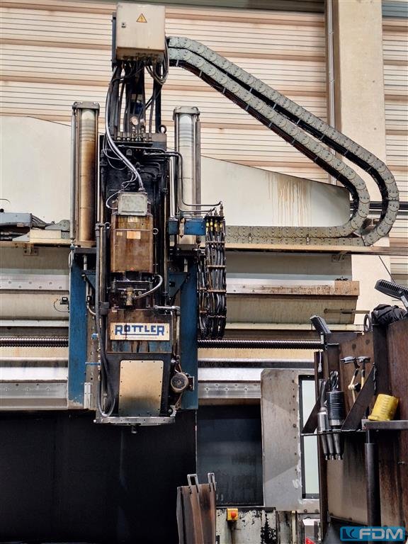 bore capacity in steel (diameter):100 mm max. pitch circle:7000 mm number of spindles:2 bore spindle turning speed range:1 - 3000 U/min high speed spindle taper ISO:50 bore slide stroke:900 mm feed speeds:1 - 6000 mm/min max. workpiece weight:18000 kg total power requirement:125 kW dimensions of the machine ca.:13 x 11 x 5,1 m with CNC SIEMENS 840 D Workpiece clamping up to dia. 7000 mm The machine is equipped with 2 drilling spindle supports and through spindle coolant (50 bar)both supports can drill simultaneously. Spindle taper SK 50, 2 stages 1 -600 rpm 1650 Nm and 1 - 3000 rpm. 300 Nm Chip conveyor and coolant device