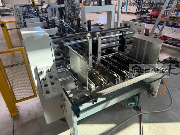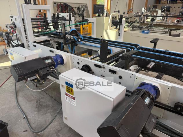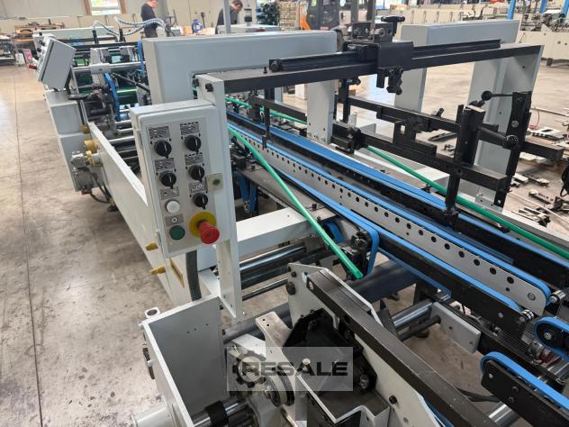 Format range: max. 1000 mm, min. 56 mm Equipment: Longitudinal seam, folding floor, double edge, 4-point gluing, motorised format adjustment, servo overhaul folding with program memory, Robatec electronic top gluing unit with 4 application heads, disc bottom gluing unit on the left, feeder with vibrator, belt crusher on the right, left up to max. 30 mm, additional central transport, folding floor module A2 with additional upper and lower centre transport, additional central transport in folding station, pneumatic kicker, counter, Bobst CUBE control, camera surveillance, Small box equipment, pneumatic press belt. Overhaul in 2026: cleaned, checked, painted and with new press belts as well as new feeder and transport belts. Other: Machine can be viewed by appointment while running.