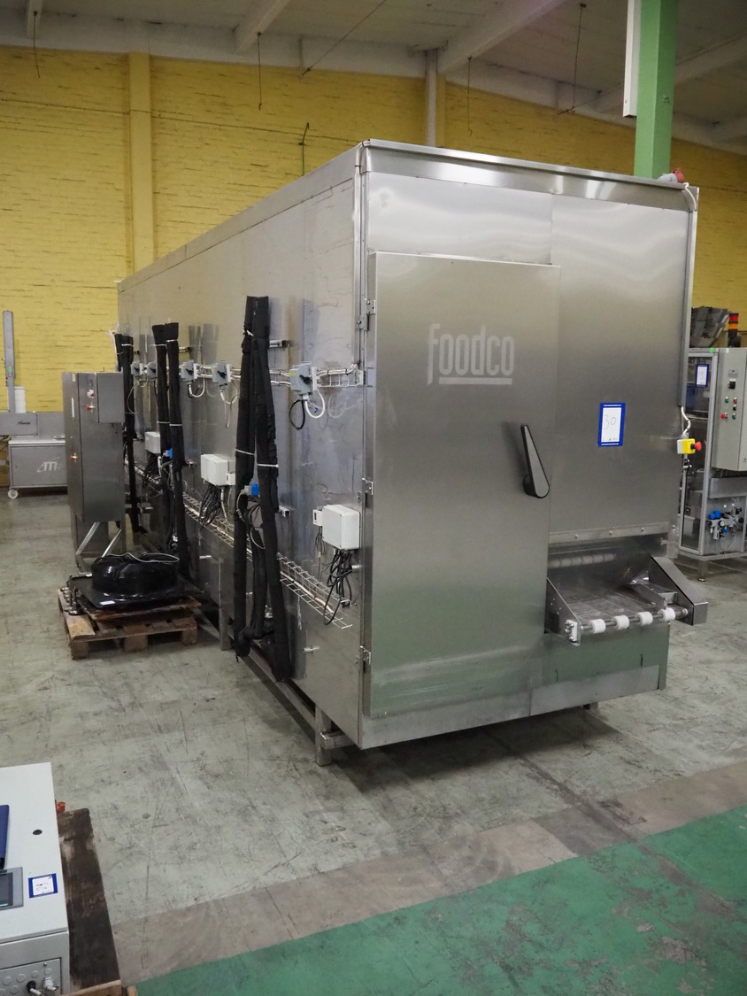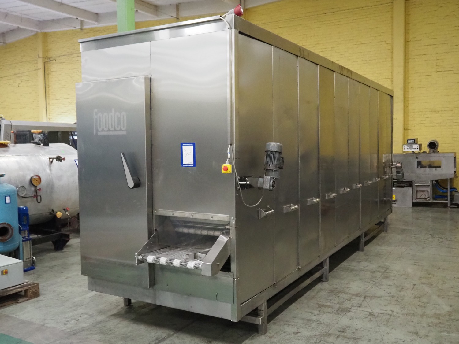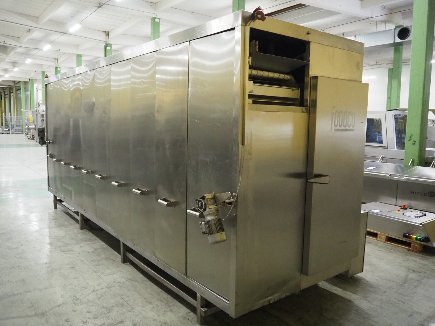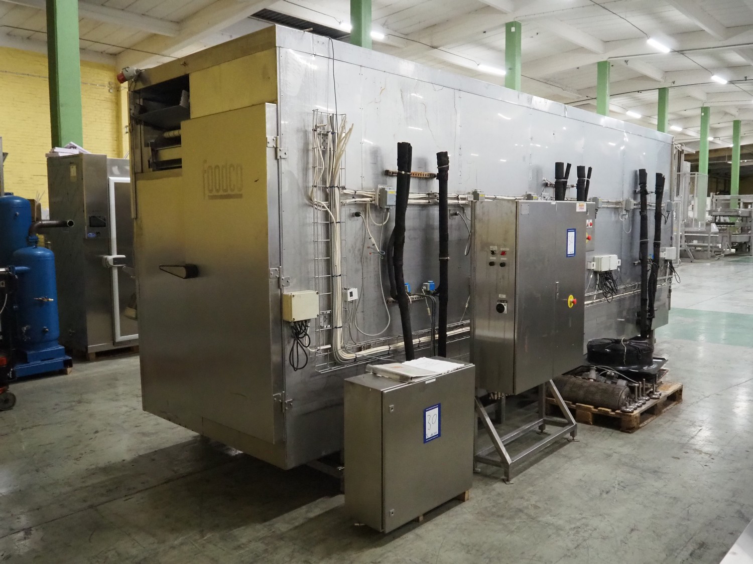 Foodco AB continuous cooling tunnel, type: FCF/C 600, number: 0115-1, 230 / 400 V, 50 Hz, 30 A, 13 kW, s/s mesh belt, belt width: 600 mm, 11 floors, dimensions cooling tunnel: 6800 mm x 2050 mm x 2750 mm, dimensions switch cabinets: 770 mm x 310 mm x 830 mm and 1400 mm x 400 mm x 1800 mm, pallet with fan and belt, dimensions: 1200 mm x 1000 mm x 500 mm.