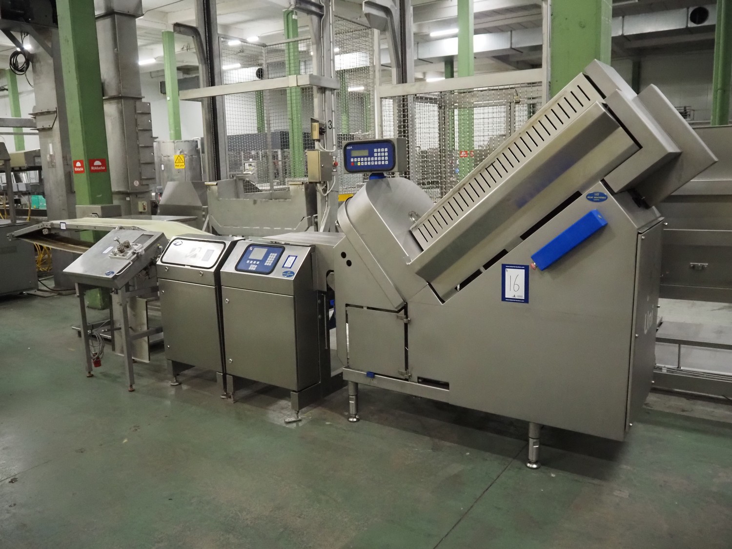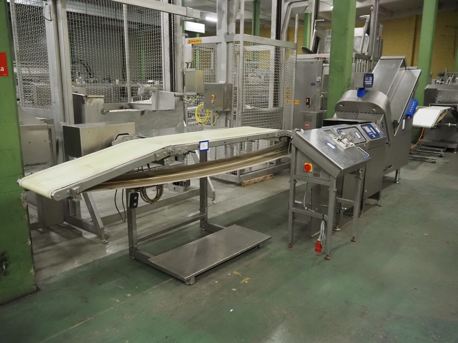 Convenience Food Systems automatic slicer line, consisting of: - Convenience Food Systems slicer, type: UNI-SLICER, number: 450.2251, year of construction: 2004, plastic belt, belt width: 230 mm, clearance: 260 mm x 140 mm, diameter knife: 420 mm, slicer dimensions: 2550 mm x 880 mm x 2170 mm. - Convenience Food Systems dividing belt, wire belt, belt width: 270 mm, dimensions: 850 mm x 610 mm x 1110 mm. - Convenience Food Systems check weigher, type: CW2000MK3 091.1992, year of construction: 2004, plastic belt, belt width: 275 mm, dimensions: 700 mm x 780 mm x 1100 mm. - Convenience Food Systems outfeed belt, type: ATB 791 991.1994, plastic belt, belt width: 400 mm, dimensions: 3030 mm x 900 mm x 1260 mm. - Convenience Food Systems knife sharpener, type: KSM 60 091.2174, year of construction: 2004, dimensions: 710 mm x 530 mm x 1170 mm.