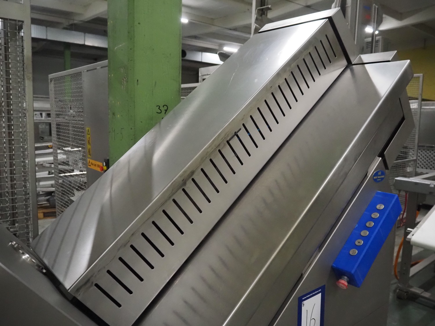 Linear cooler for donats/pastries/cakes etc. Linear cooler, consisting of the following components: - Conveyor belt with drive - Insulating housing - Evaporators and others - Refrigeration technology - Control cabinet Geometric specifications External dimensions Length: approx. 7,800 mm Width: approx. 1,800 mm plus control cabinet Height: approx. 2,400 mm plus valve station Inlet height: approx. 880 mm Spout height: approx. 1,030 mm Technical performance data using the following example: Nougat Donut (Master) Product weight: approx. 80 g Product size (Ø x H) approx. 100 x 35 mm Processing capacity: 320 kg/h = 4,000 pcs/h Throughput time: approx. 3.5 min, adjustable Power connection: 400 V, 3 Ph, 50 Hz Total power requirement: 30 kW Radiator dimensions (LxWxH): 7,800 x 1,800 x 2,400 mm Condition: well-maintained, fully functional Availability: immed ...