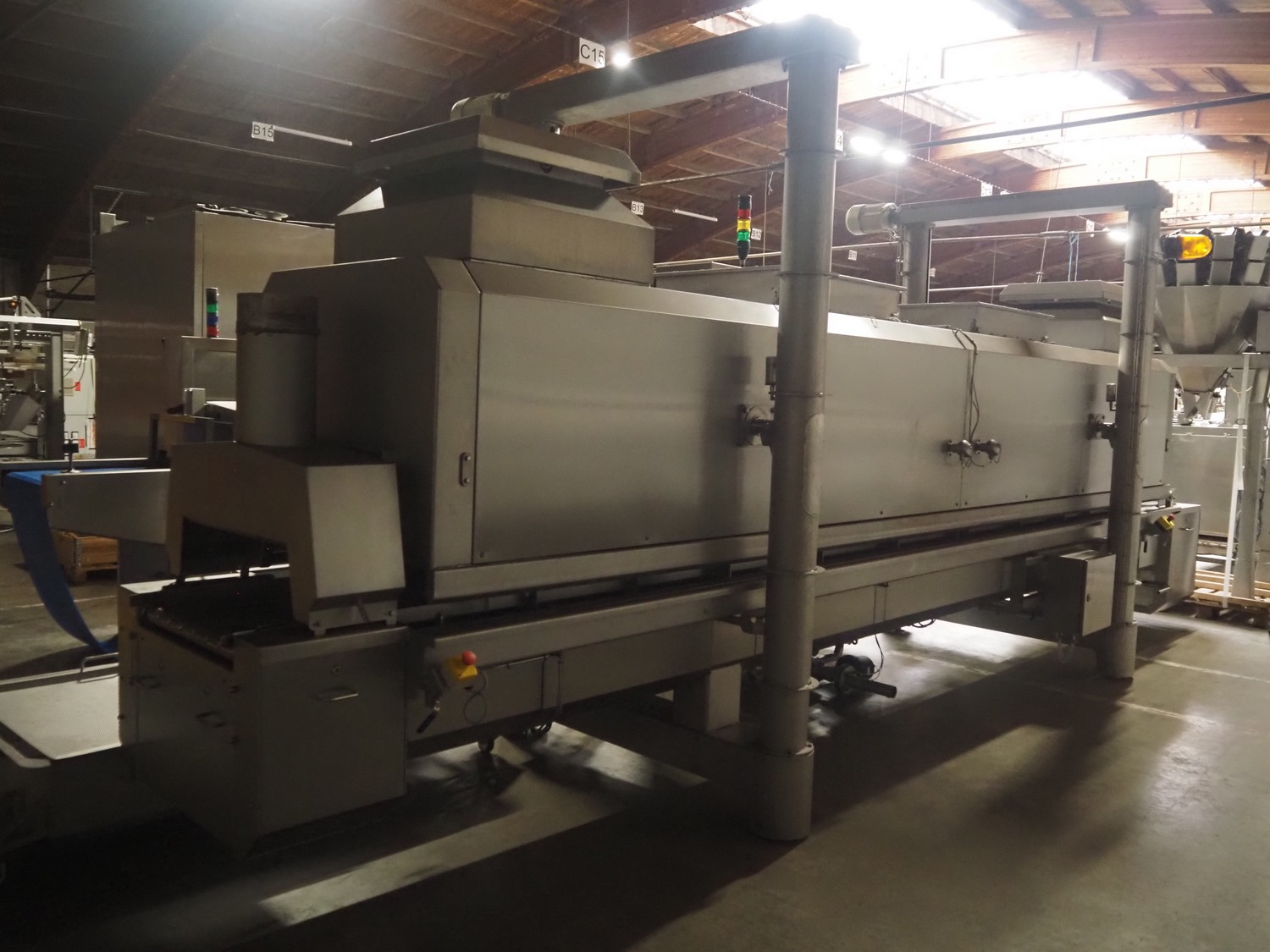 Used roasting/baking oven from Food Design Applications – Ireland Model: MSOG/2-100/800 Burners: Lanemark International Heating power: two burners: 2x 170kW = 340kW It is possible to connect steam. It can also work as a cooler, dehumidifier Two independent zones Electric blow height adjustment Electric blowing force adjustment Electric belt speed control Direct wash possible Indirect heat distribution system (tubular heat exchanger) Lower waste tray Stainless Tape, Braided with Belt Tensioning System Complete stainless steel chimneys, including exhaust gas control fans Natural gas Dimensions: Chamber (tunnel) height (adjustable) max. 250mm Tape width 950mm Belt width – working space 920mm Length of the whole machine 10250mm Baking Length 8000mm Machine width 2030mm Height with motors 3250mm Acid-resistant design.