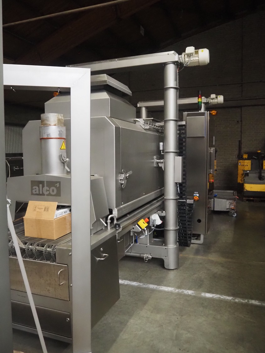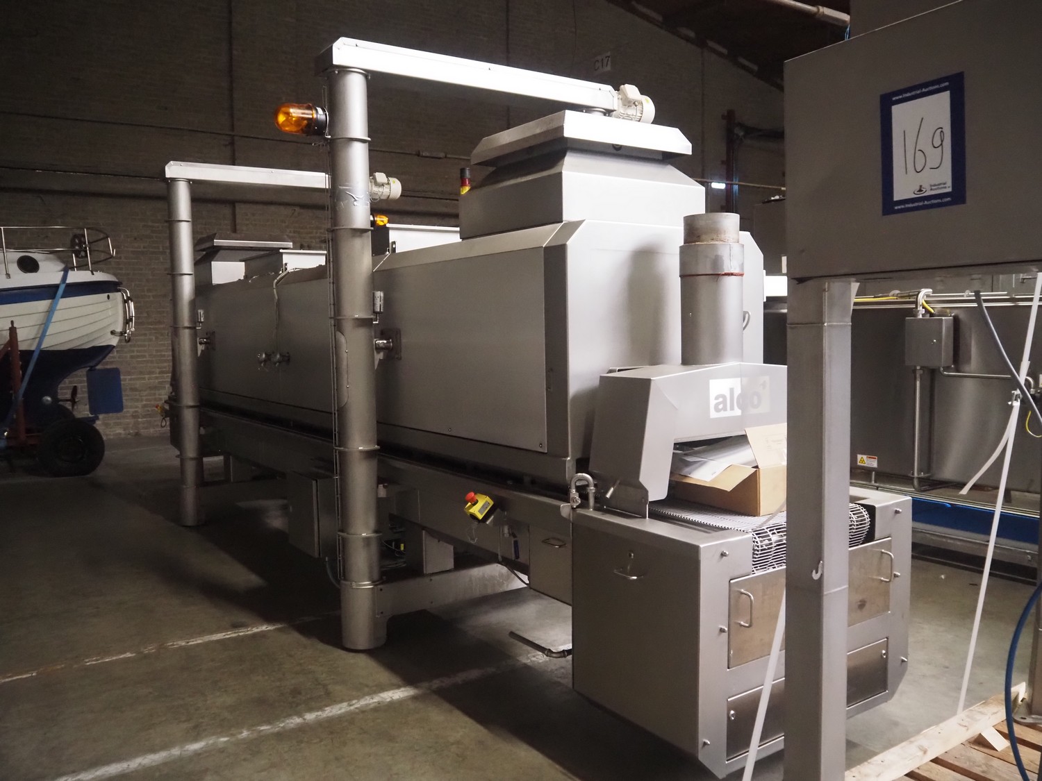Alco food-machines hot air tunnel, type: AGU 600/6000-E, serial number: 02725228, year of construction: 2017, 400 V, 50 Hz, 222 A, 148 kW, weight: 4000 kg, s/s mesh belt, belt width: 600 mm, cooking length: 6000 mm, clearance: 680 mm x 250 mm, total dimensions: 7100 mm x 1900 mm x 2700 mm. Including s/s filter tub.