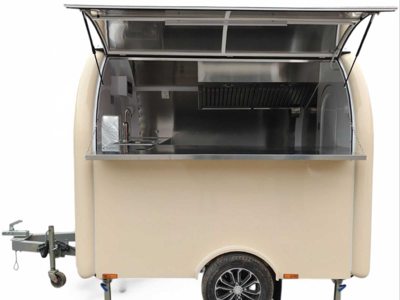 New food trailer – Immediately deployable This beautiful food trailer is completely new and unused. Ideal for entrepreneurs who want to start immediately without waiting time. Specifications and implementation • Refrigerated workbench with freezer function • Extractor hood with adjustable position (hard/soft) • Sink with hot and cold water, equipped with heat pump • LED lighting inside and outside • Full stainless steel interior • Multiple sockets, also under the workbench • Ready to use Benefits • Weight under 750 kg, suitable for B driving license • No own license plate required, license plate of the car is sufficient • Compact and practical design Dimensions • Length: 2.3 meters • Width: 2 meters Suitable for street food, catering and events. Auction-ID: A1-42012-56