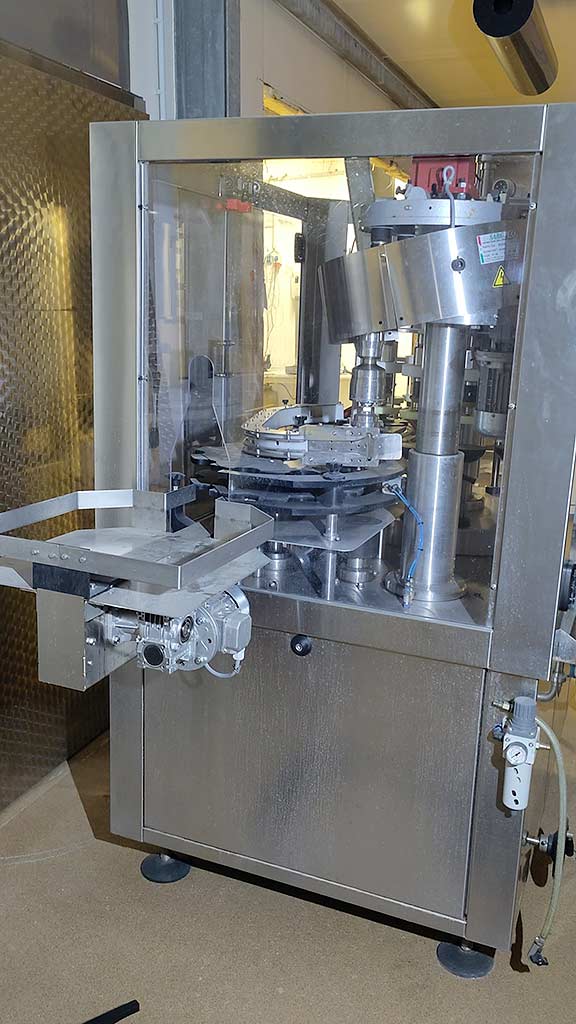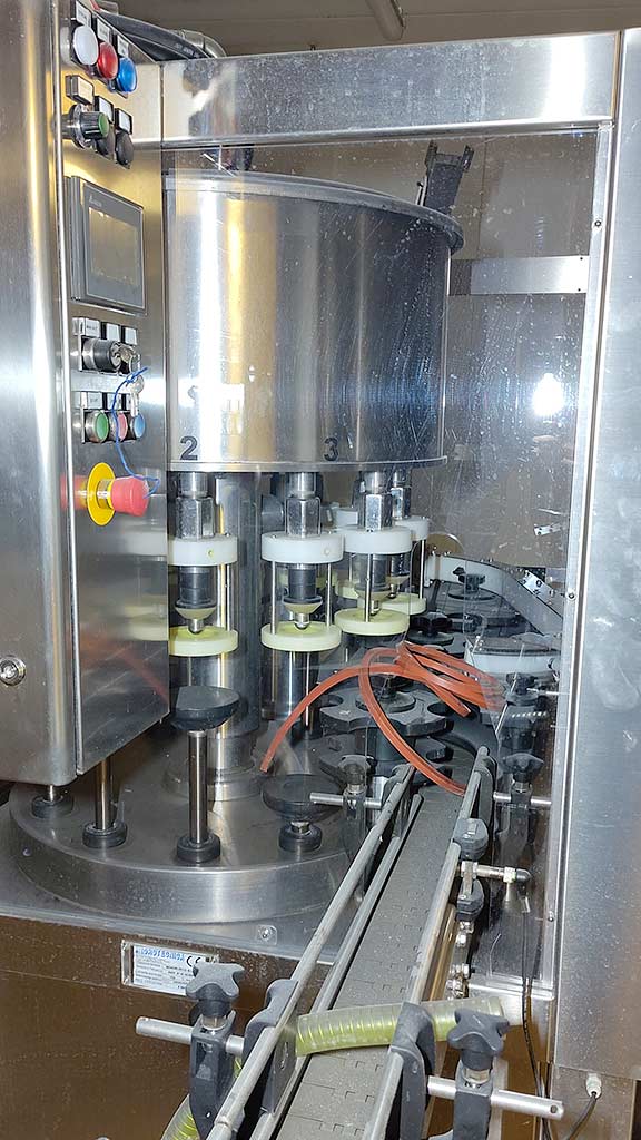 A complete filling line with a 12-position gravity and vacuum filler with integrated twist-off capper for the food industry is available. Filling stations: 12, design: rotary machine, liquid viscosity: thin-medium, filling capacity: approx. 2000bottles/h, capping capacity: approx. 1000-1200/h, containers: heat-insulated, container volume: 35l/50l. This is a complete filling line including conveyor belts, accumulation table, sensors, rotary tables, pumps and format parts. The system was taken out of operation in 2024. Documentation available. An on-site inspection is possible.