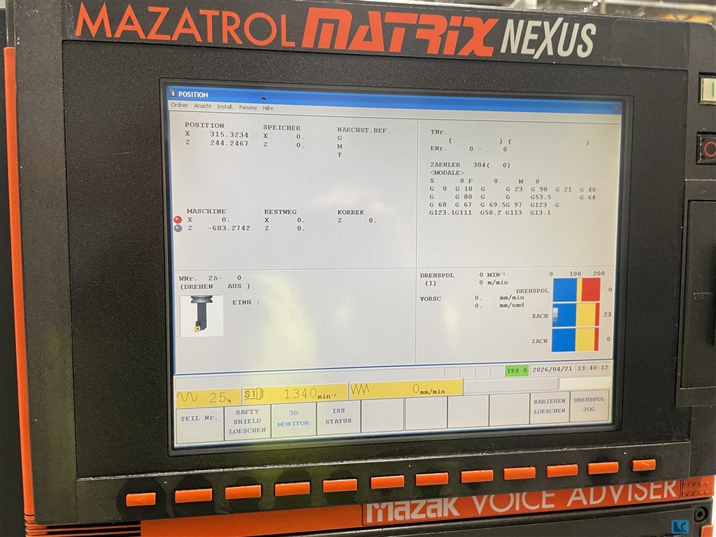 swing diameter:320 mm control:840 D SIEMENS turning speeds:5000 1/min spindle drive:20 / 27 kW chucking diameter:250 mm travel -x axis:650 mm travel -z axis:300 mm turret head:12 Pos. tool holder:VDI 40 toolpiece turning speed range:4000 1/min work piece power:max. 11,7 kW weight of the machine ca.:8 t CNC vertical lathe, live tools, C-axis, high pressure pump 20 bar, 500l, filter, flush gun, 3-jaw chuc, EWAB loading station right, chipconveyor, approx. 23.500h "machine on", approx. 8.000h "spindle on" (in total) MACHINE WILL GET NEW (OVERHAULED) SPINDLE (0 hours)