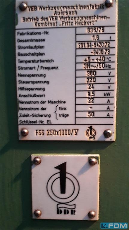 grinding length:1000 mm grinding width:250 mm workpiece height:400 mm total power requirement:12 kW weight of the machine ca.:3,8 t dimensions of the machine ca.:3.300 x 1.800 x 2.300 mm hydraulic power unit:400 x1000 x 1500 mm control cabinet:2 Stück, 1000 x 1400 x 1500 mm