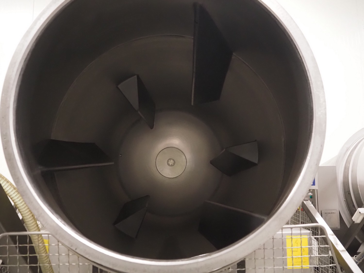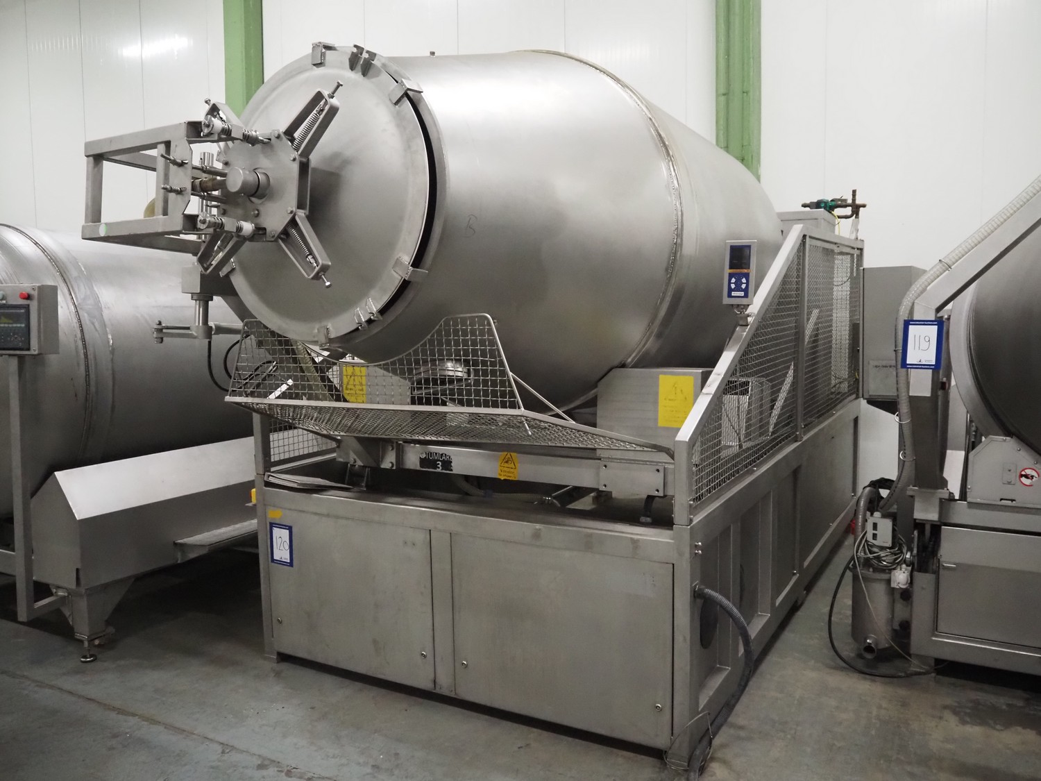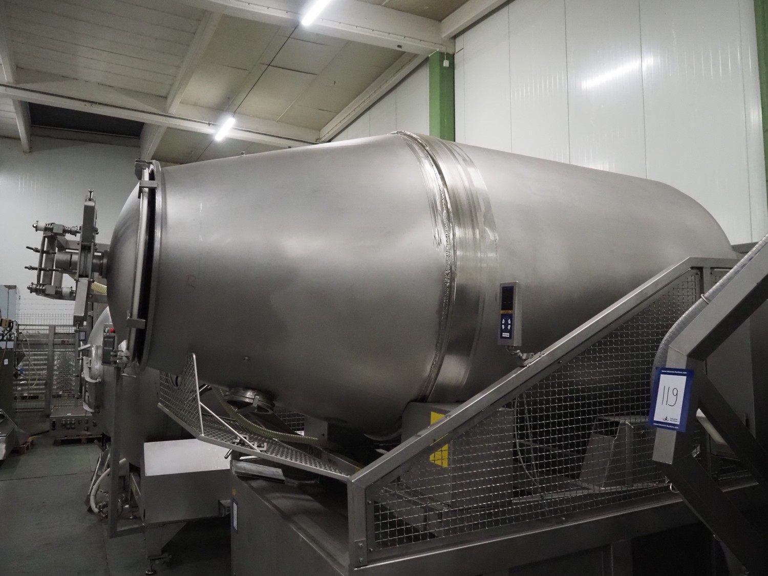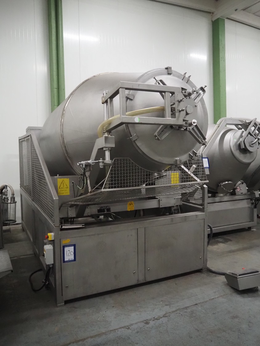 Garos vacuum tumbler with double jacket for cooling on weighing cells, type: MDF1600K, serial number: 26308026, year of construction: 2003, 3 x 380 V, 50 Hz, 5.2 kW, volume: 1600 liter, capacity: maximum 1100 kg, speed: 1.8 - 8.0 rates per minute, infeed height: 1650 mm, outfeed height: 880 mm, weight: 1650 kg, total dimensions: 3070 mm x 1900 mm x 2250 mm.