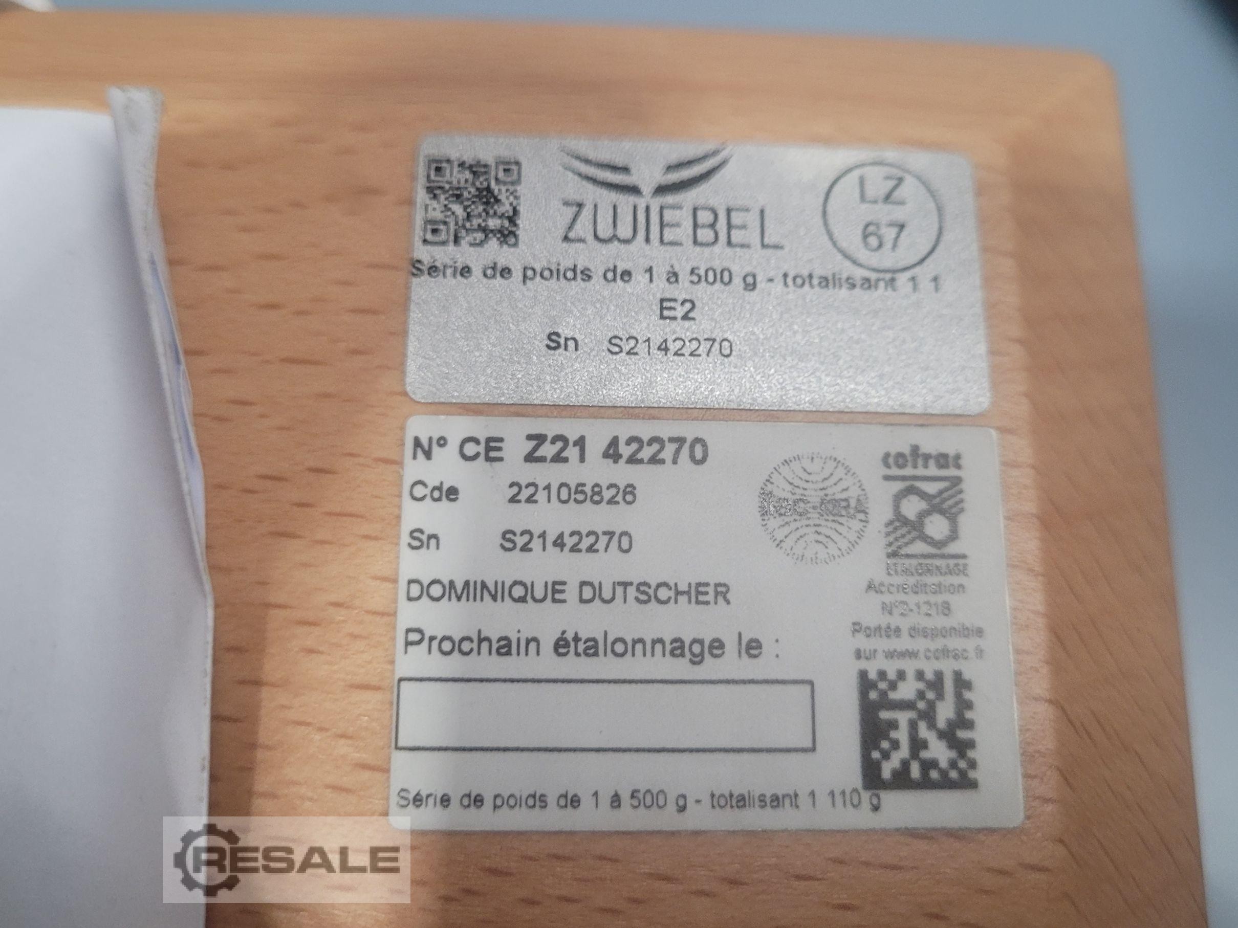 Set of 12 E2 weights from 1 g to 500 g - ZWIEBEL New equipment in its original packaging Type: COFRAC weight series Class: Class E2 Weight: 1g / 2g / 5g / 10g / 20g / 50g / 100g / 200g / 500g Weight Material: Cobalt Alloy / Stainless Steel With wooden box