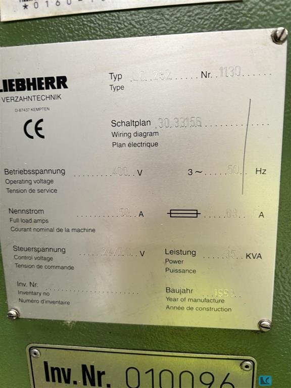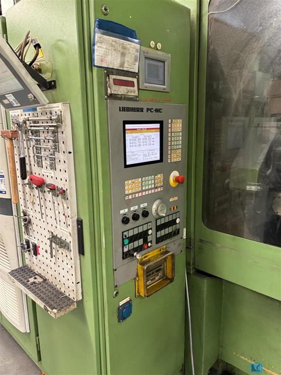 max. wheel diameter:300 mm max. module:7 weight of the machine ca.:15 t table turning speeds:100 U/min table diameter:180 mm hob turning speeds:750 U/min max. hob diameter:300 cutter length max.:230 mm Liebherr LC300 with loading automation Machine including counter holder The machine used to work with emulsion