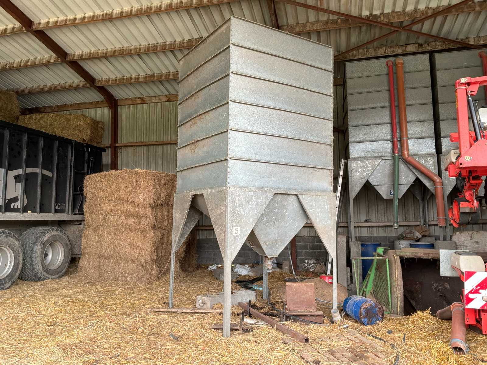 Silo Plant I consisting of 12 hopper silos with entrance doors. sight glasses and ventilation hoods. Built in 2 individual rows of 6 (each to the left and right of the bucket elevator) along the hall wall. Total storage volume approx. 348 tons (29 tons per silo) Type LS III, in galvanized version A/B, Modular system in particularly stable construction, Dimensions 3.10m x 3.10m, 3.75m high, capacity approx. 26.3to (Pricing: Ex-factory sales, loaded/dismantled by the buyer)