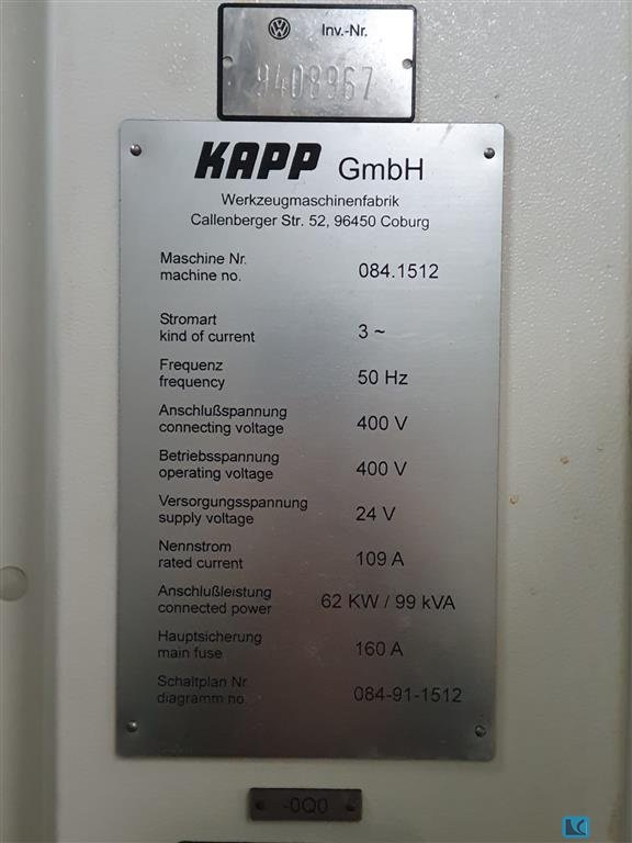 weight of the machine ca.:24 t dimensions of the machine ca.:3900 x 3500 x 2500 m -the machine has no B axis -two grinding spindles with one grinding wheel each - The transport instructions can be found in the documentation (attachment). including Hoffmann KSM filter system Loading list available Operating data v. 03/27/2023: Operating time: 21727 h / production time: 11960 h Machine documentation: 1 set of circuit diagrams, electrical plans, operating instructions Accessories: 2 replacement measuring heads Marposs S/500; prism supports Other: Hoffmann KSM filter system Machine condition: according to age, due to processing with emulsion