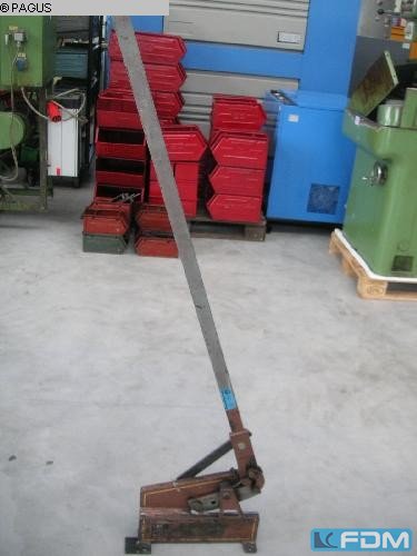 offer 22501 Technical data approx.: - working width 1020 mm - material thickness at 40 kg/mm² strength 1.5 mm -one. Backgauge adjustable up to 550 mm - front angle stop - Sheet metal hold-down - Table size 1100 x 650 mm - Working height 900 mm - Space requirement approx. W 1800 x H 1450 x D 850 mm - Weight approx. 400 kg -mobile