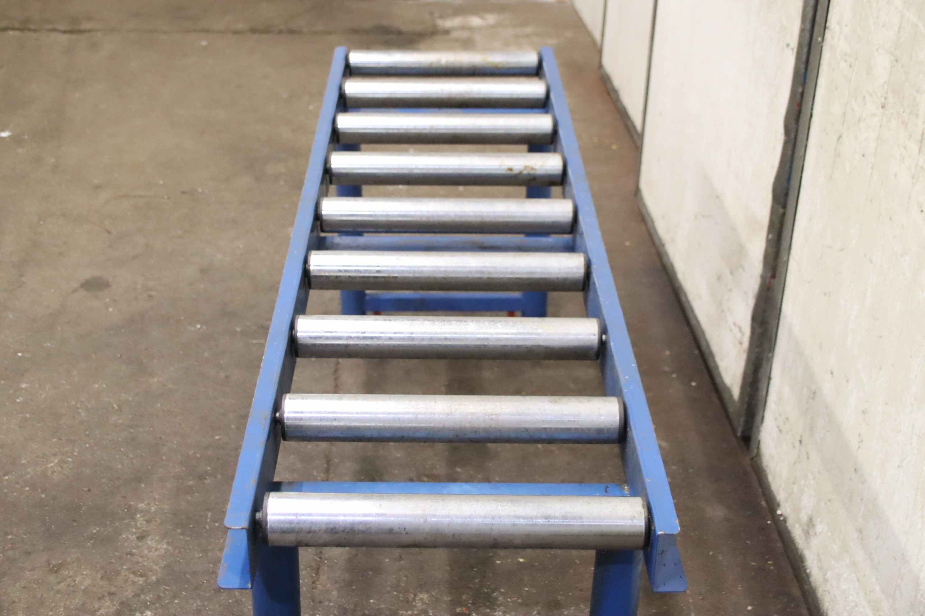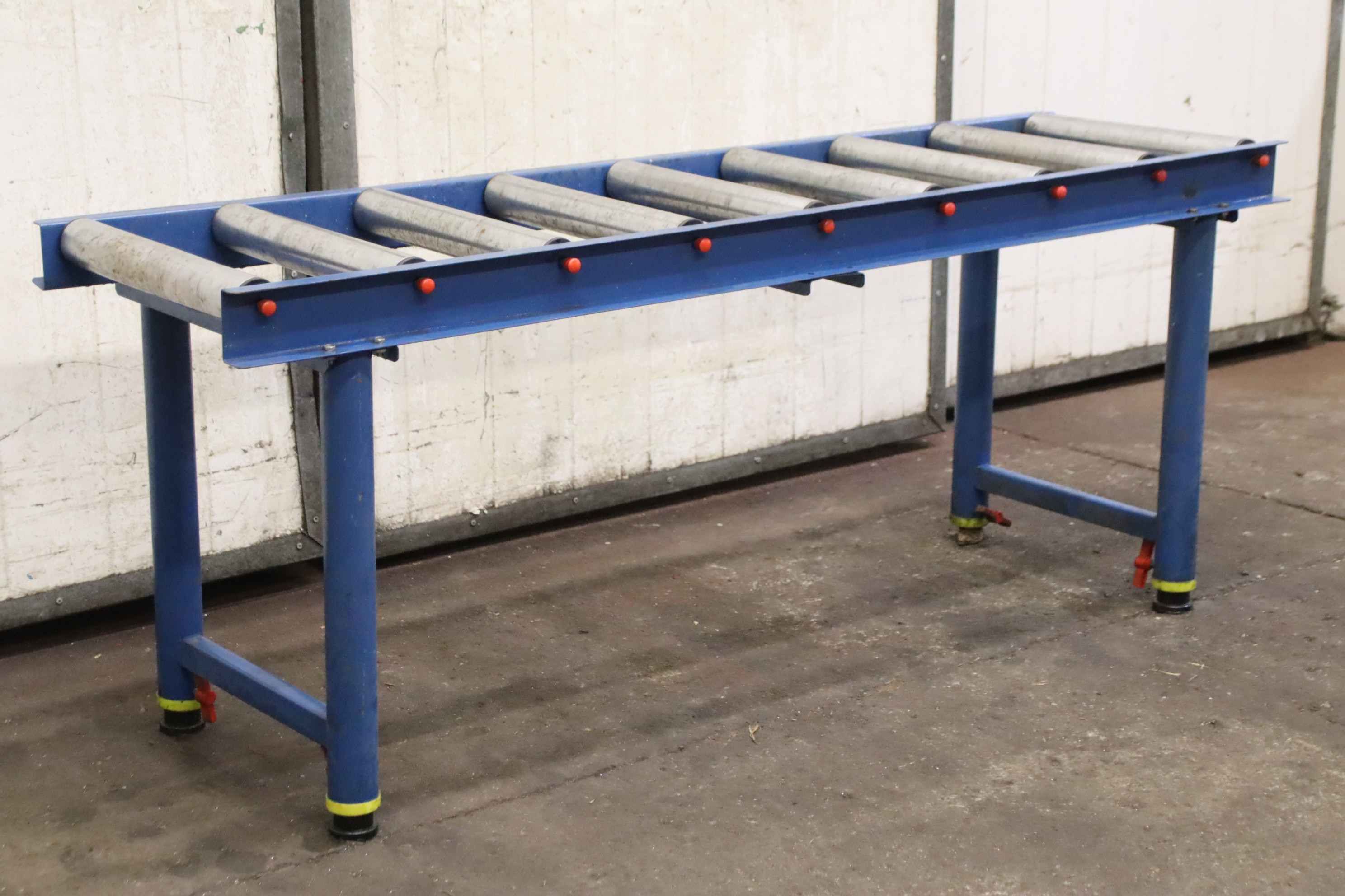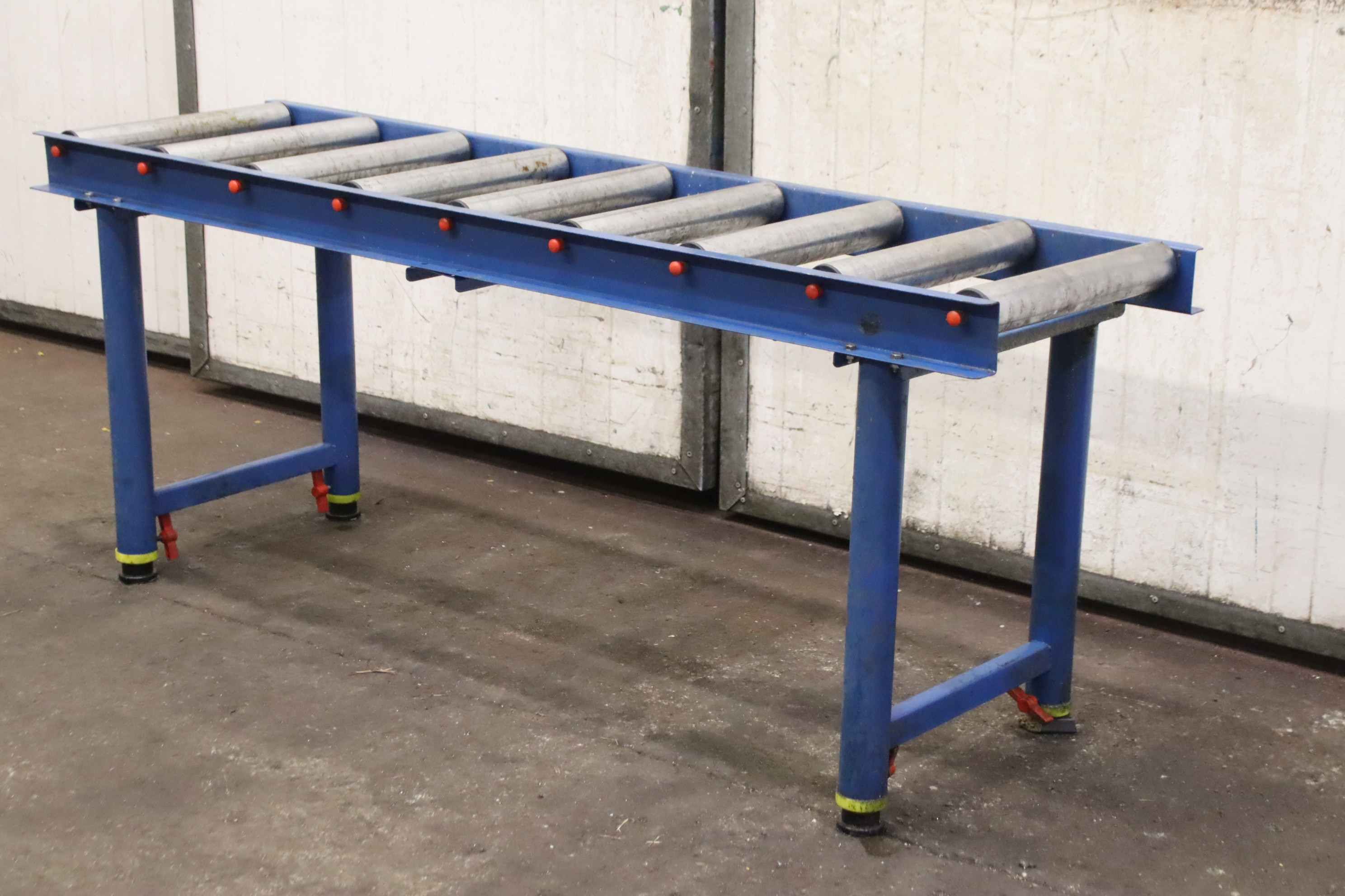Roller conveyor, conveyor track, roller conveyor belt, roller track -Roller conveyor: not powered, length 1.65 m on a solid base frame, height adjustable -Roll width: 400 mm -Roller diameter: 57mm -Roller spacing: 195 mm -Height: 655 to 1140 mm, one foot is missing -Transport dimensions: 1650/500/H655 mm -Weight: 27 kg
